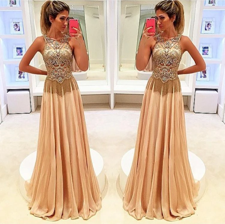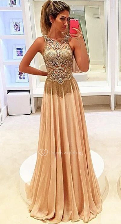 Newest Beadings Chiffon Illusion Prom Dress A-line Sweep Train