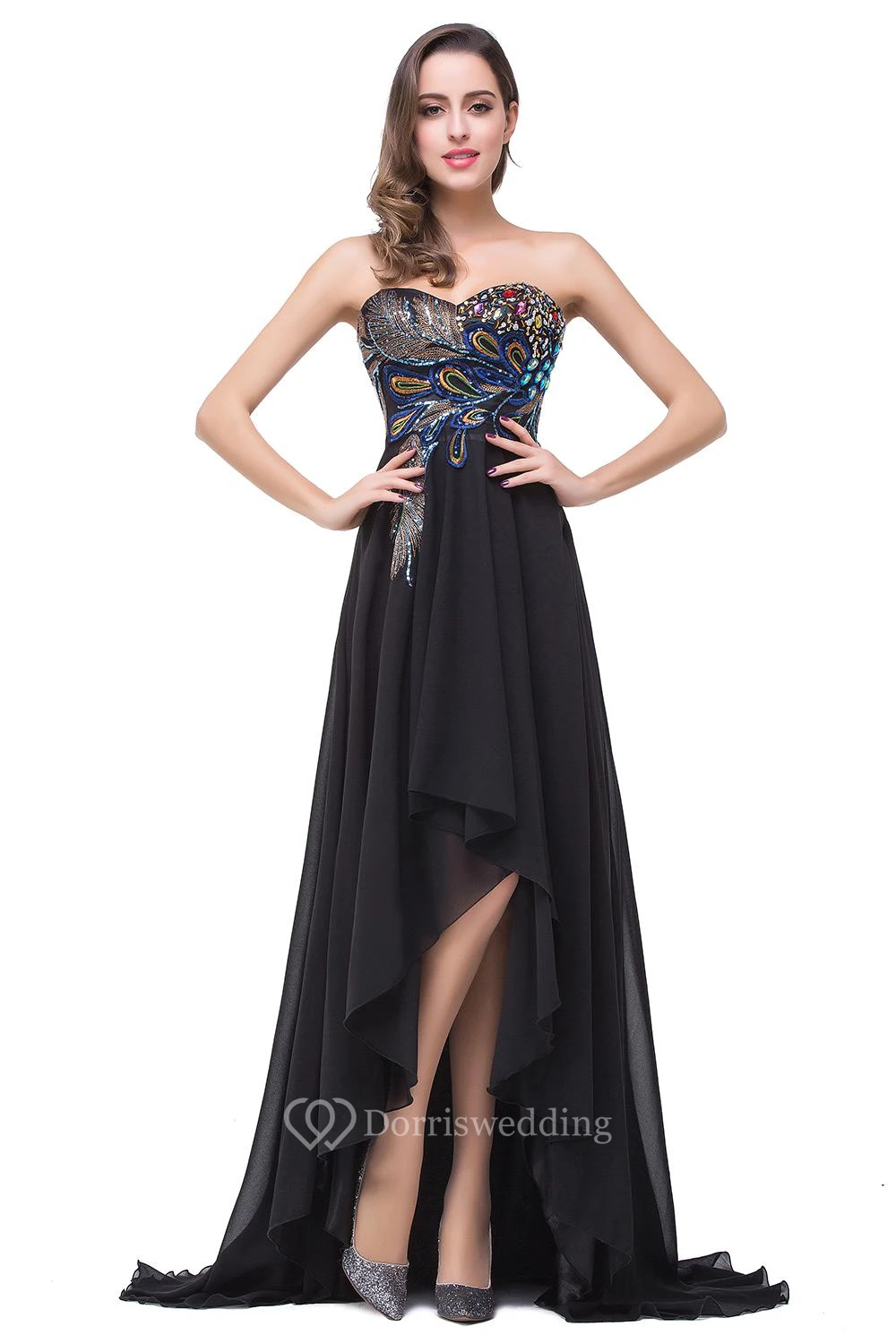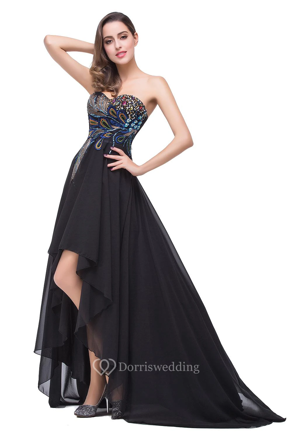 Newest Black Chiffon Peacock Prom Dress Hi-Lo Sweep Train