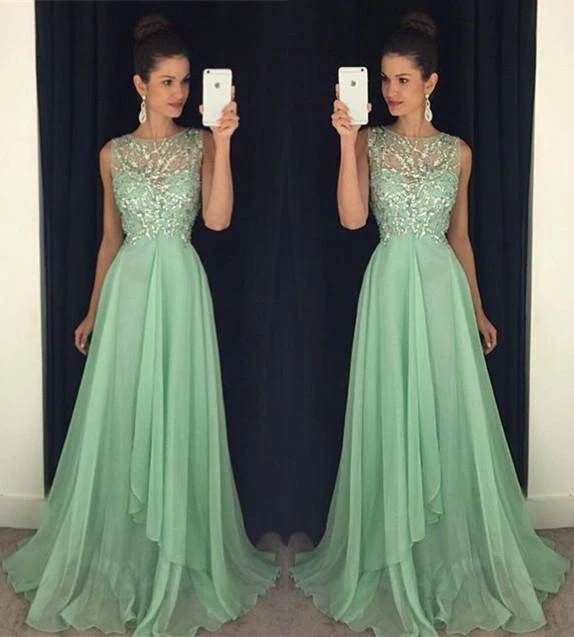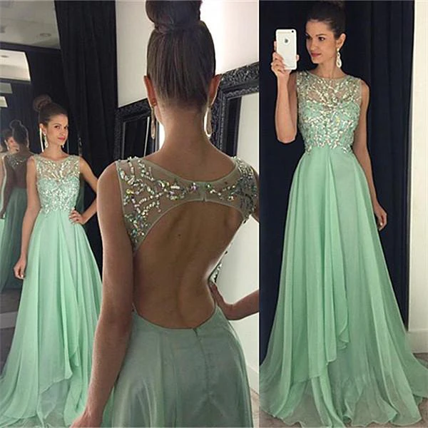 Newest Chiffon Beadings A-line Prom Dress Illusion Sweep Train