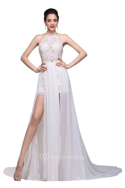 Newest High Neck Elegant Prom Dress Long Beadings Chiffon Evening Gown With Lace Appliques