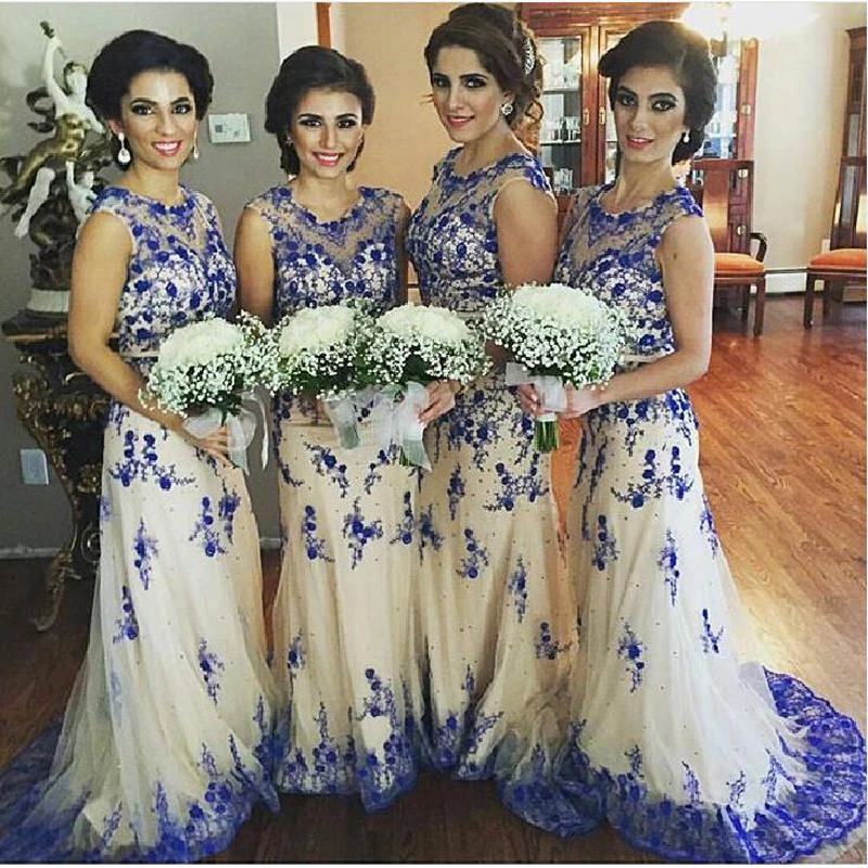 Newest Lace Appliques Illusion Bridesmaid Dress Sweep Train