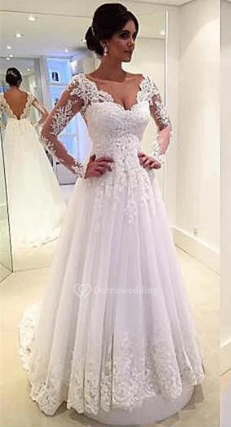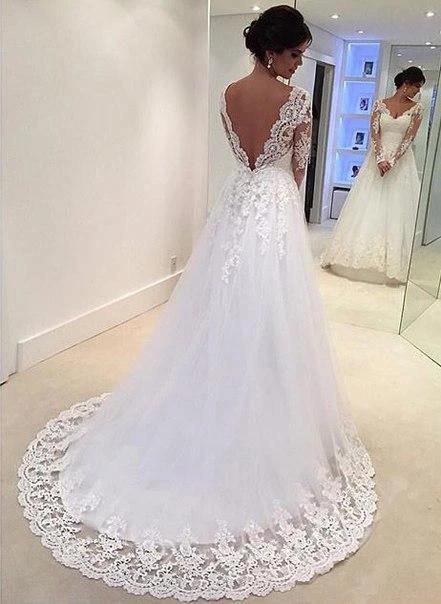 Newest Long Sleeve Tulle Lace Wedding Dress Court Train