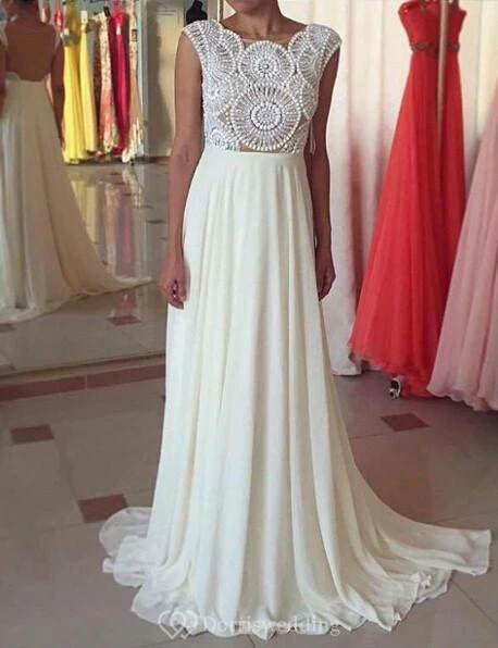 Newest Pearls Chiffon A-line Prom Dress Cap Sleeve Sweep Train