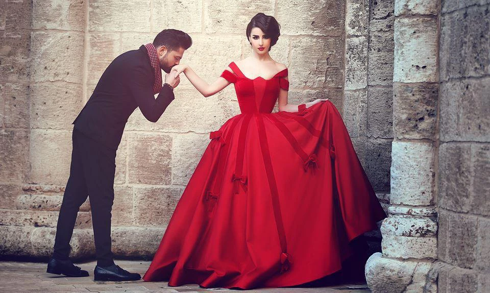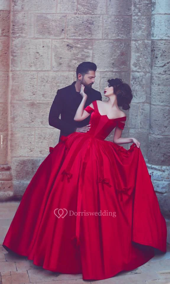 Newest Red Bowknot Ball Gown Evening Dress Off-the-shoulder Floor-length