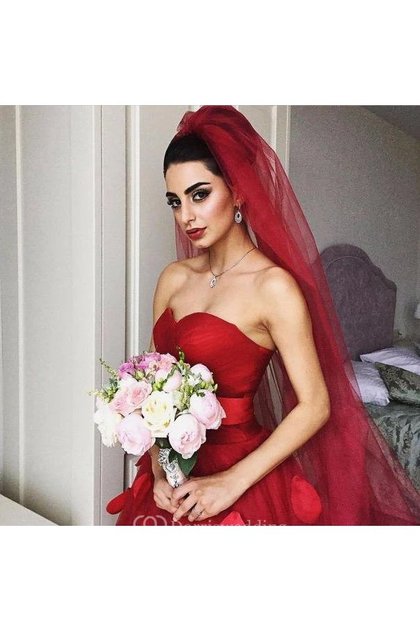 Newest Red Tulle Princess Wedding Dress Flowers Court Train