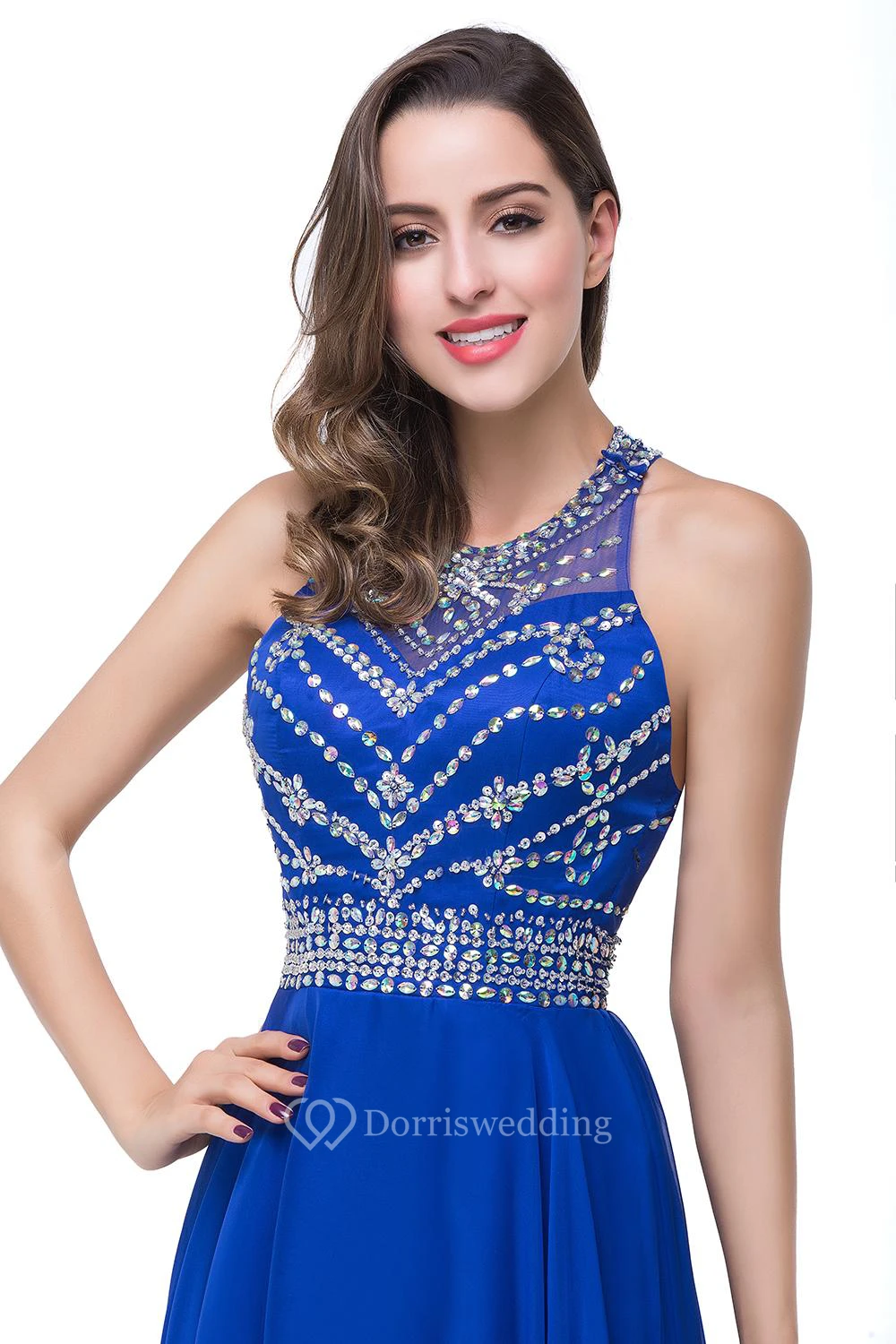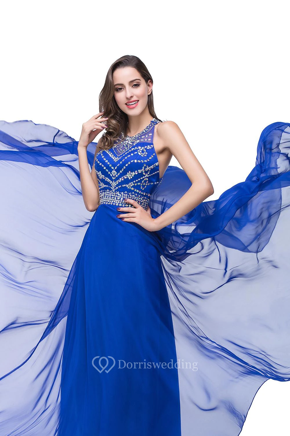 Newest Royal Blue Chiffon Prom Dress A-line Beadings Sweep Train