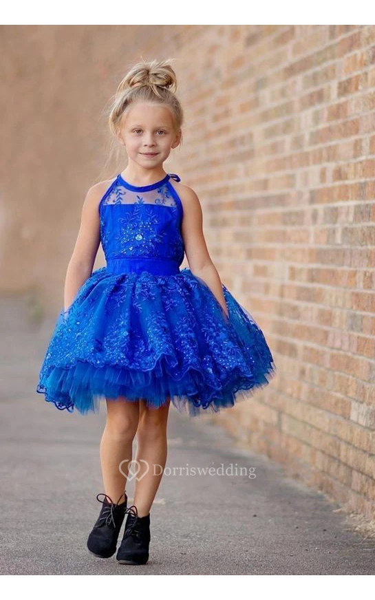 Newest Royal Blue Lace Appliques Flower Girl Dress Halter Puffy Mini