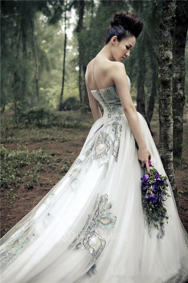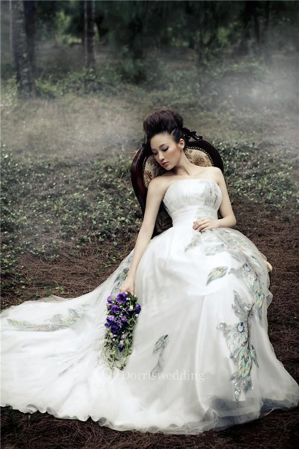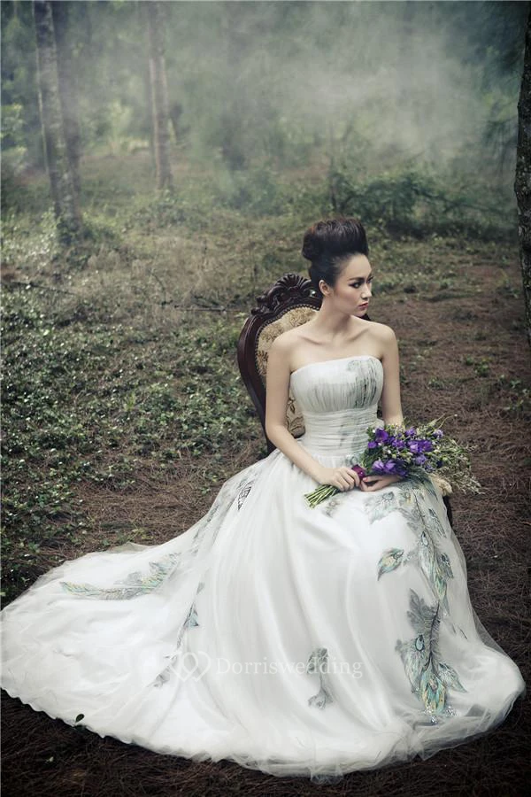 Newest Tulle Strapless Princess Wedding Dress Print Flower Court Train
