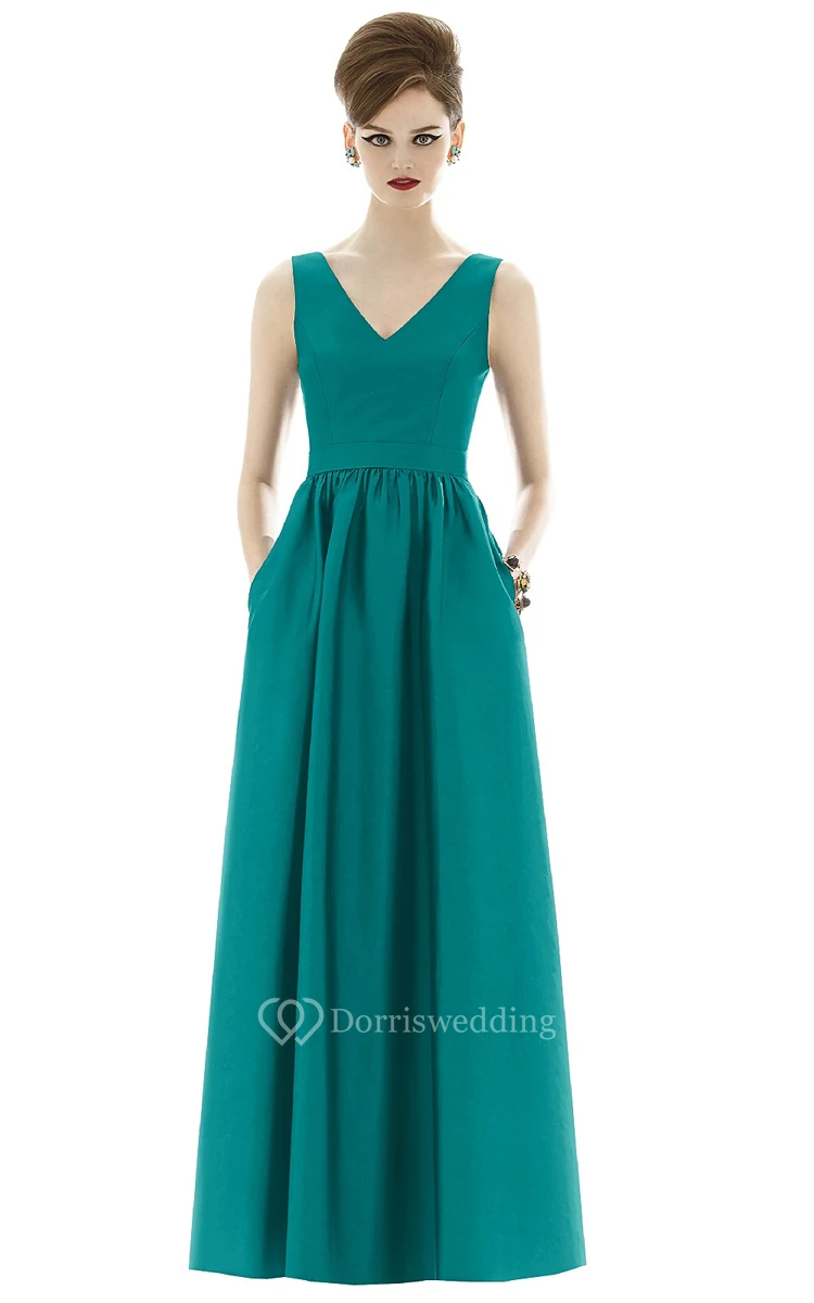 Noble Floor-Length V-Neck Satin Gown with Pockets and Pleats