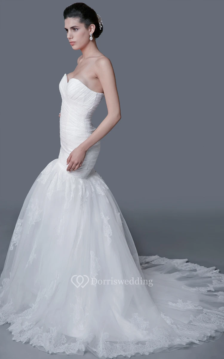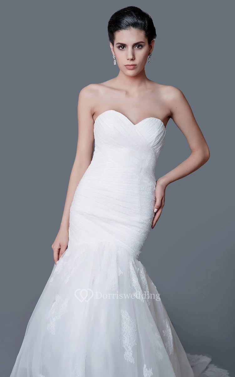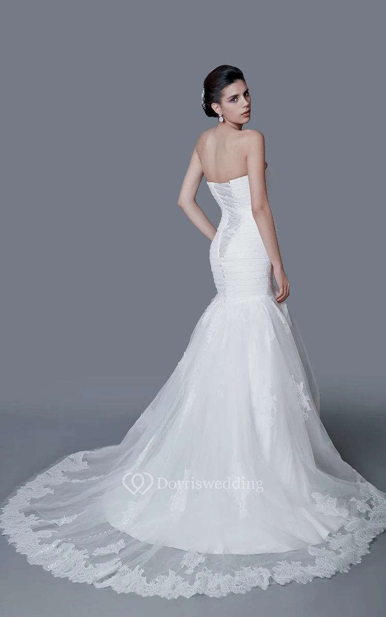 This mermaid wedding gown is all in the details. The strapless bodice has a sweetheart neckline, with a criss-cross ruching pattern and a lace-up back. The trumpet skirt begins mid-thigh, and ends in a long and dramatic court train.?Lace applique covers the skirt and creates a scalloped hemline, and buttons go down the length of the skirt.