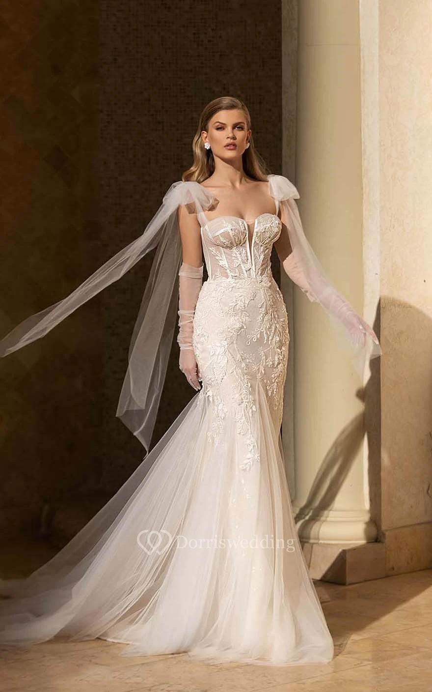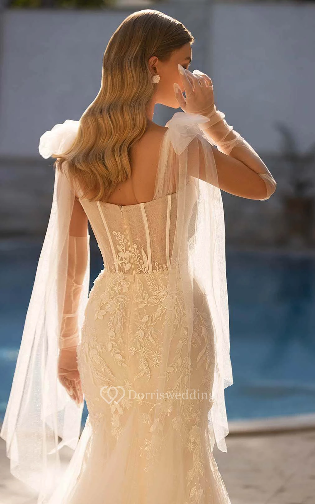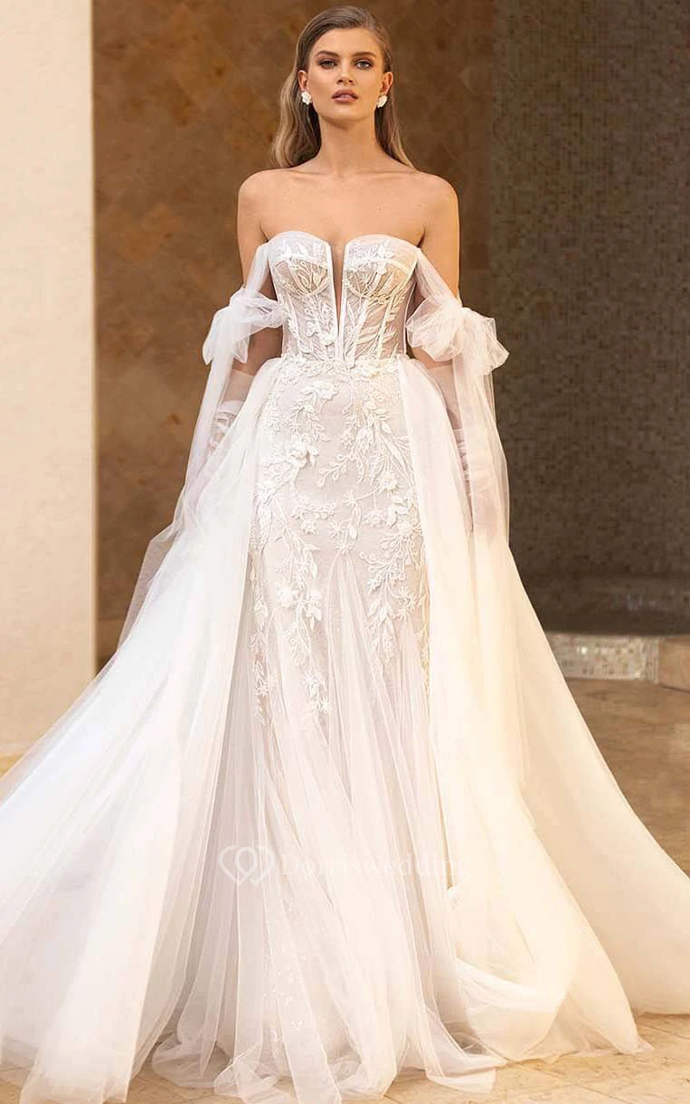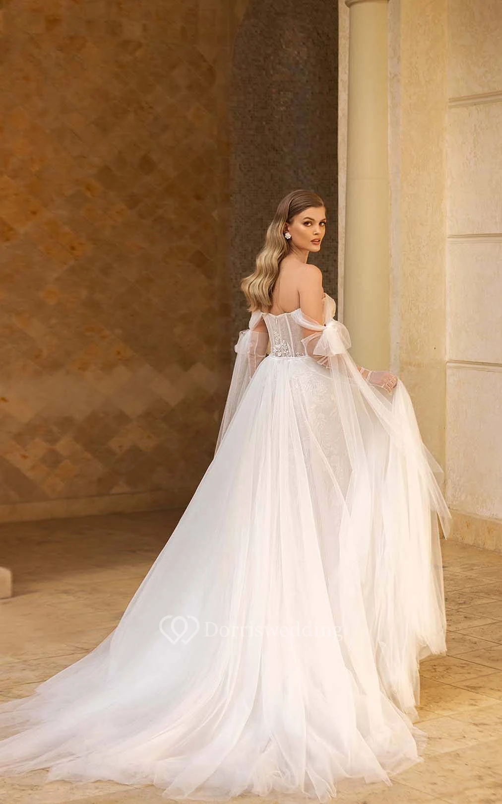 Notched Sweetheart A-line Mermaid Tulle Lace Princess Wedding Dress with Straps and Detachable Skirt