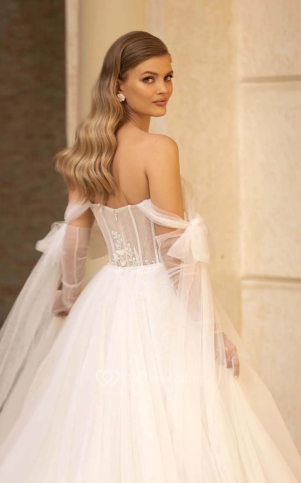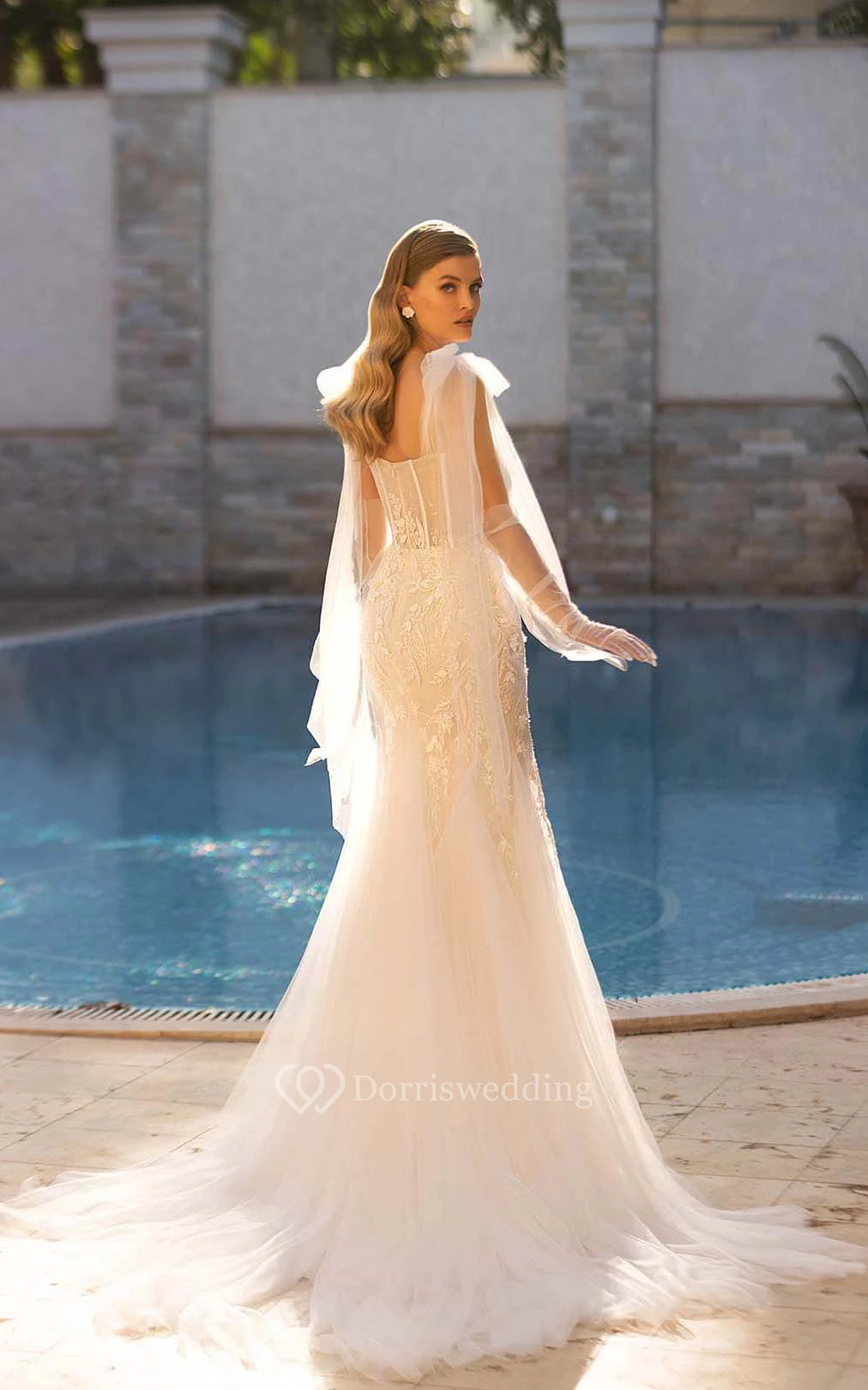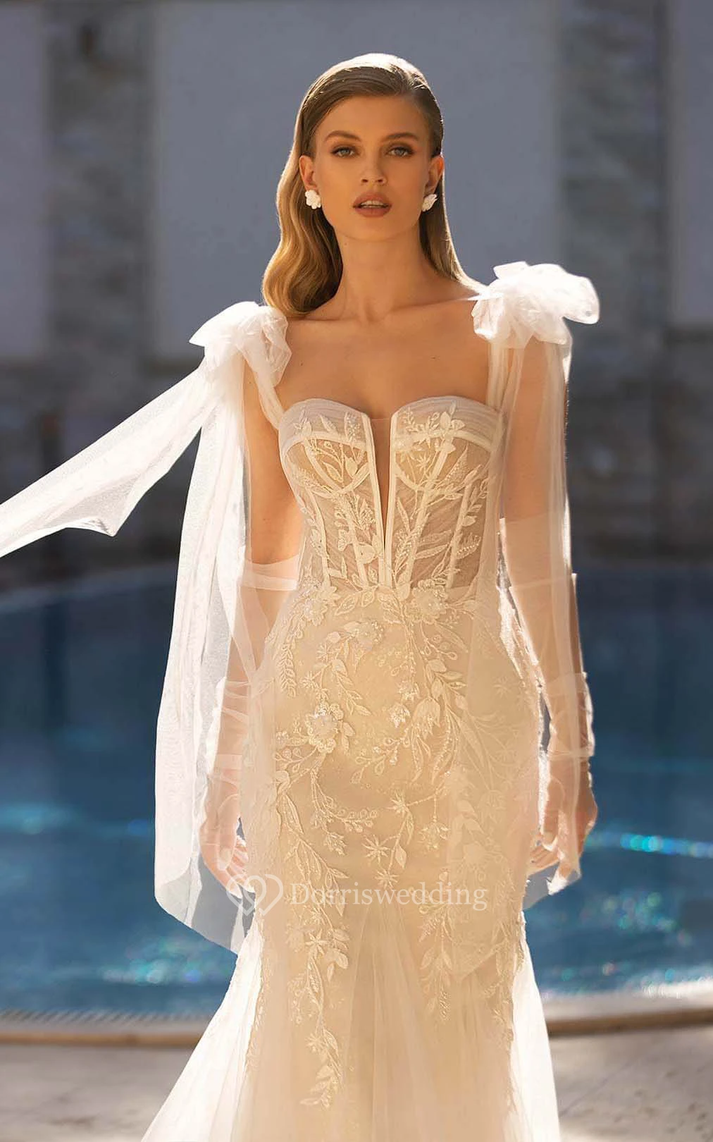 Notched Sweetheart A-line Mermaid Tulle Lace Princess Wedding Dress with Straps and Detachable Skirt