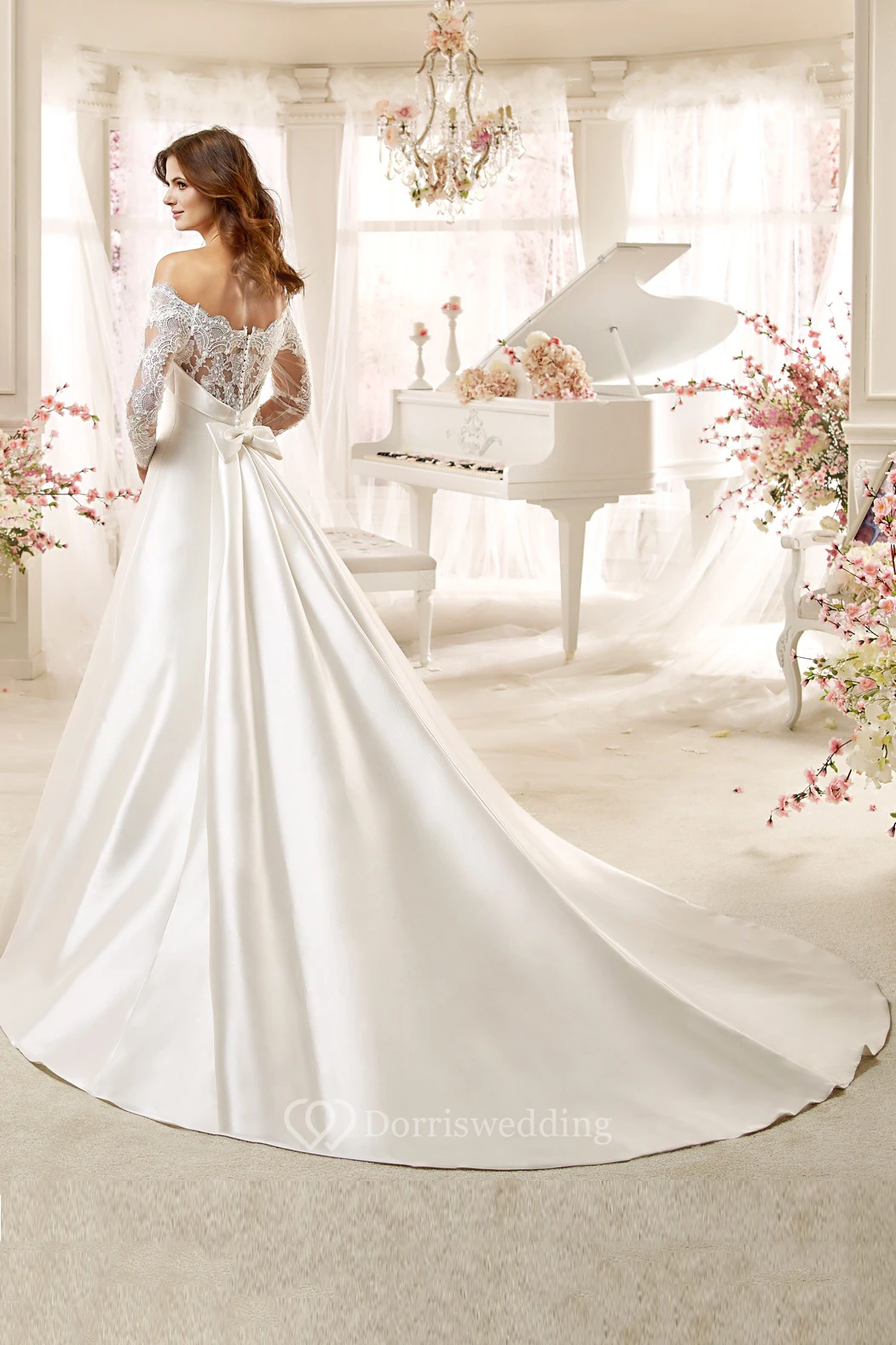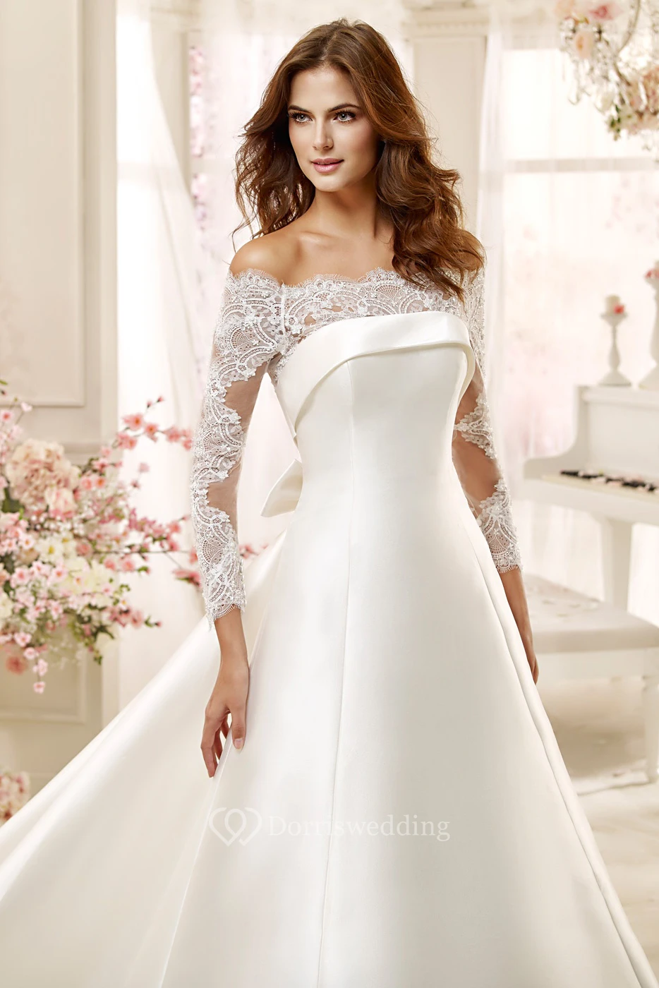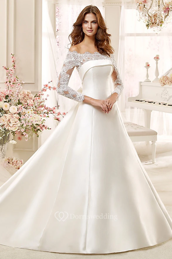 Off-Shoulder A-Line Satin Wedding Dress With Lace Long Sleeves And Brush Train