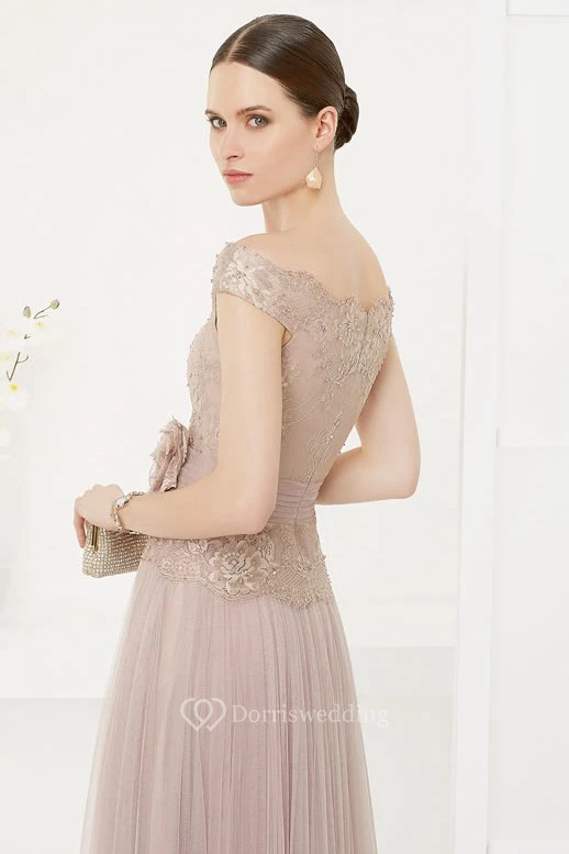 Off Shoulder A-line Tulle Long Dress With Lace Top And Flower Sash