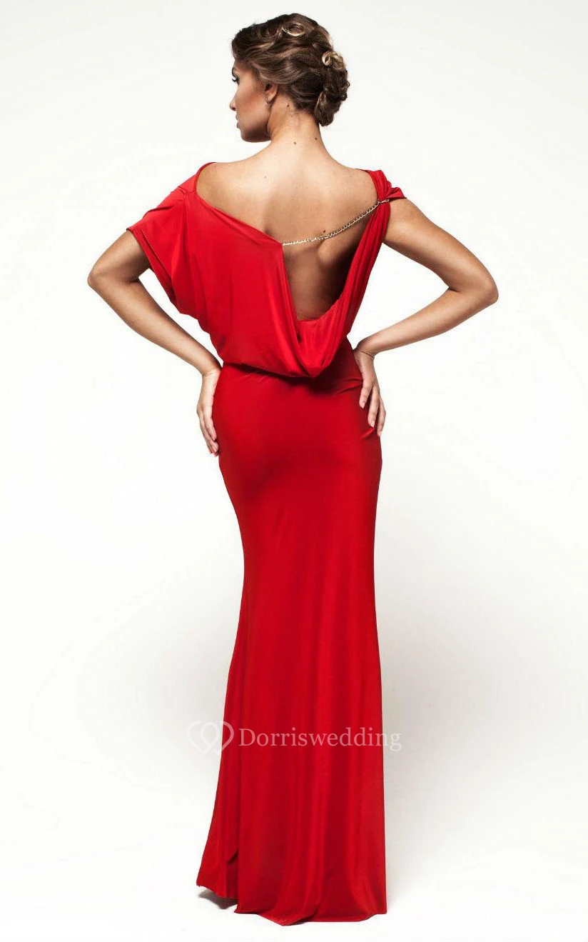 Off Shoulder Dropped Back Sheath Jersey Long Dress With Ruching