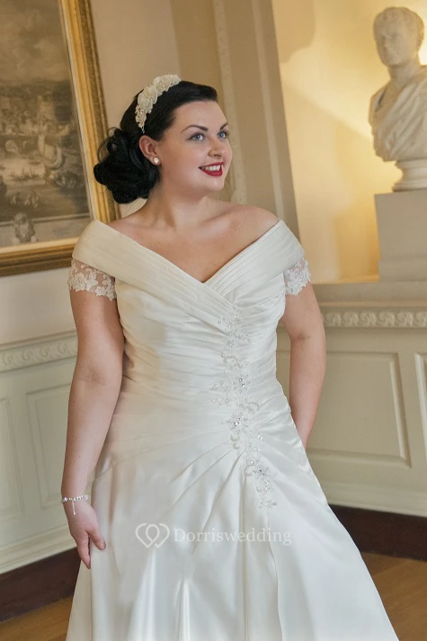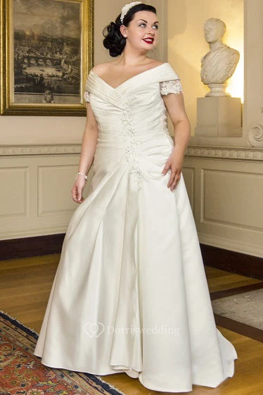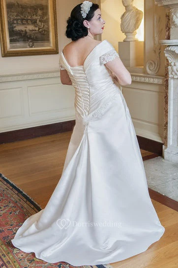 Off Shoulder Lace Short Sleeves Taffeta Bridal Gown With Lace Up