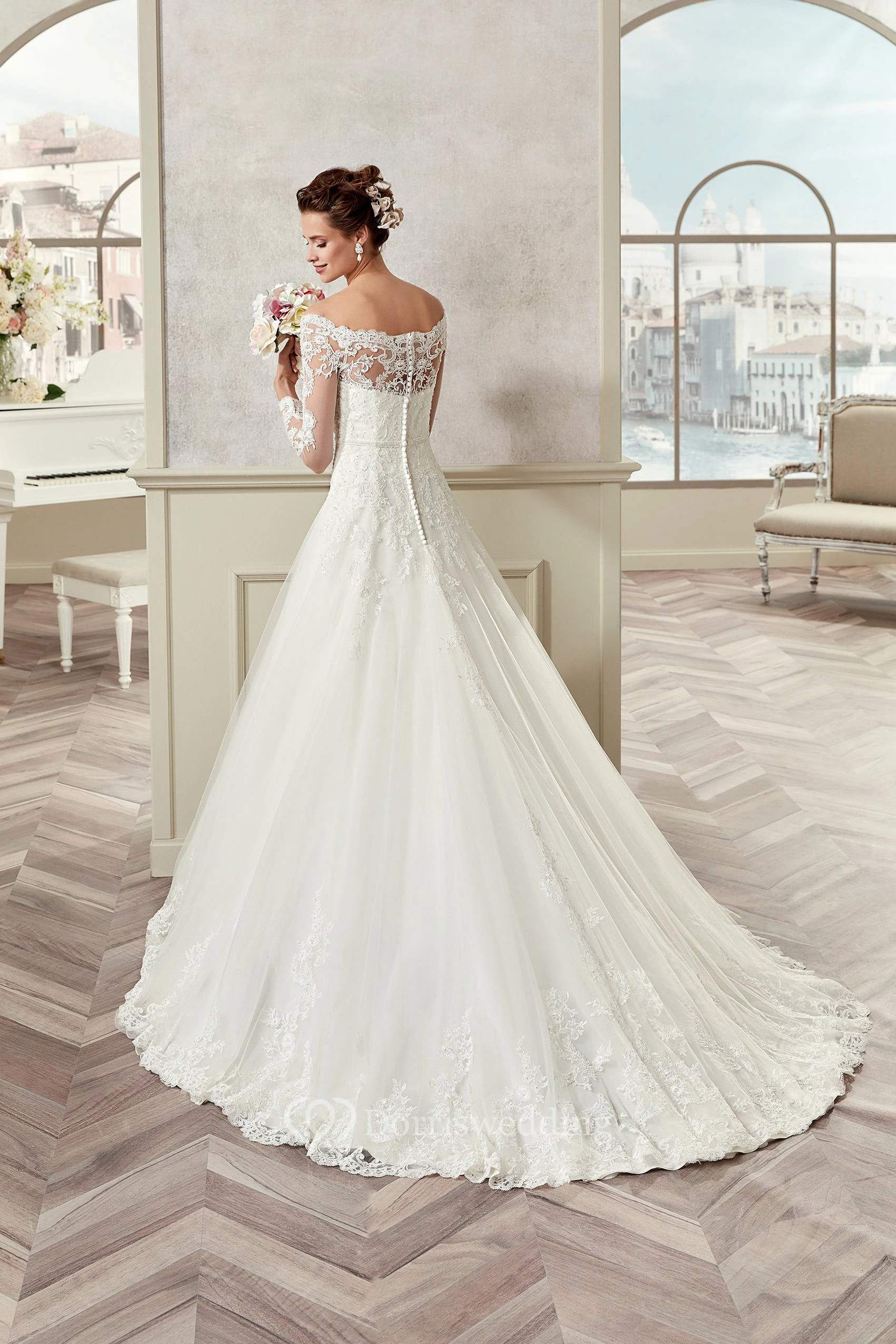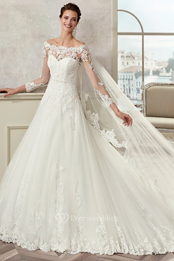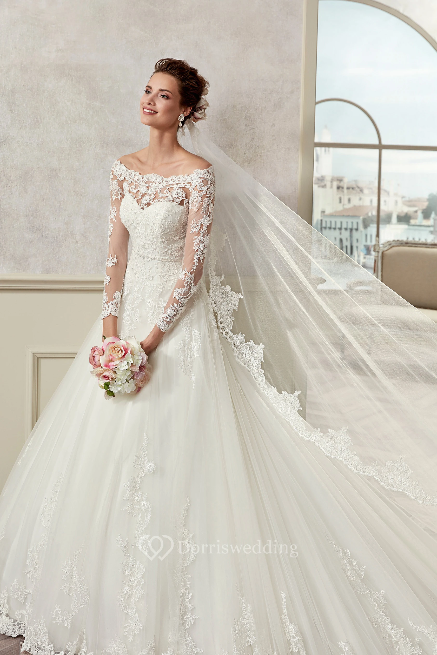 Off-Shoulder Long-Sleeve A-Line Bridal Elegance Gown With Illusive Design And Brush Train