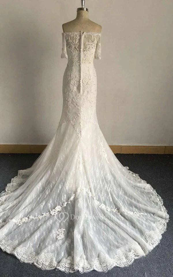 Off-Shoulder Mermaid Lace and Tulle Gown With Court Train