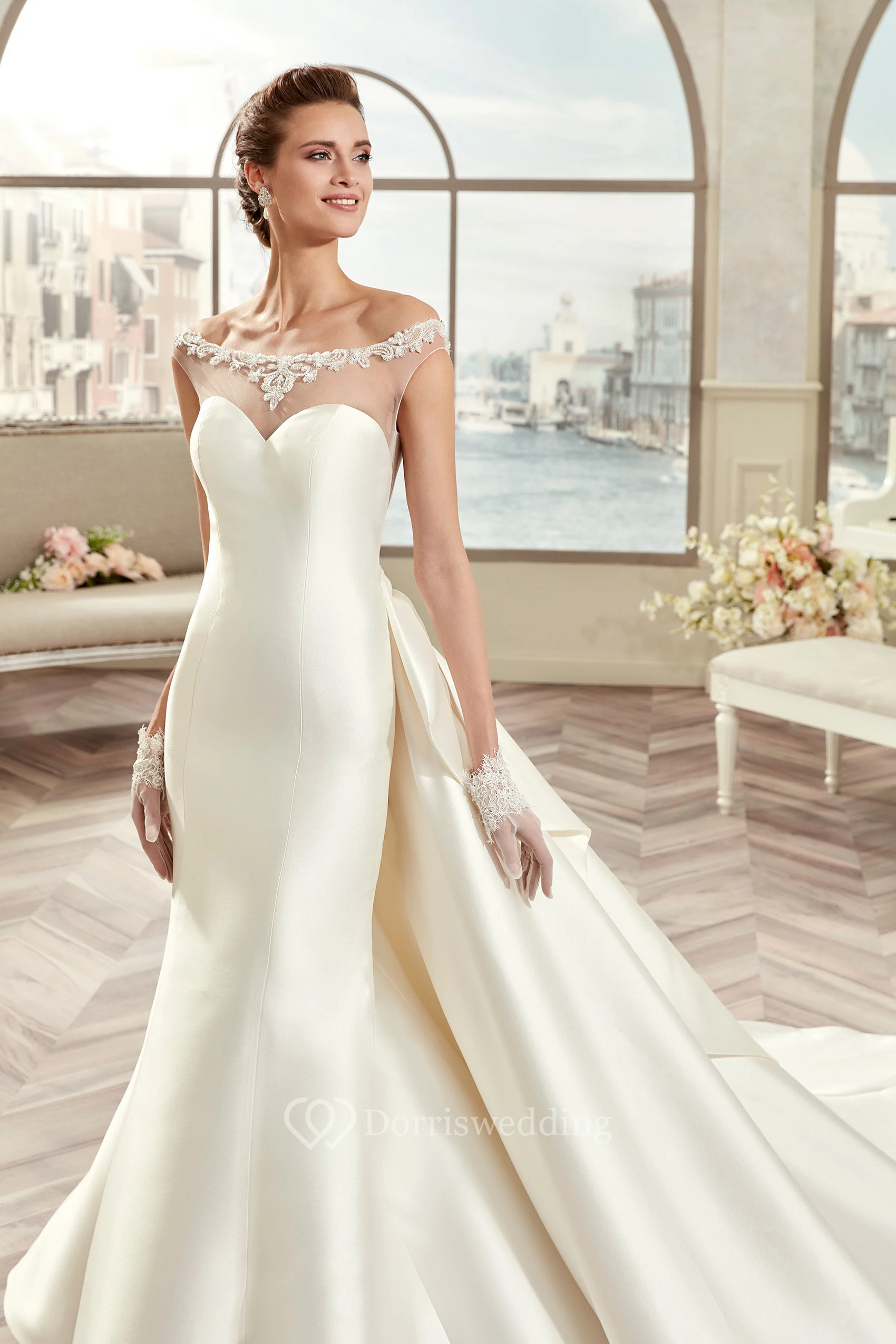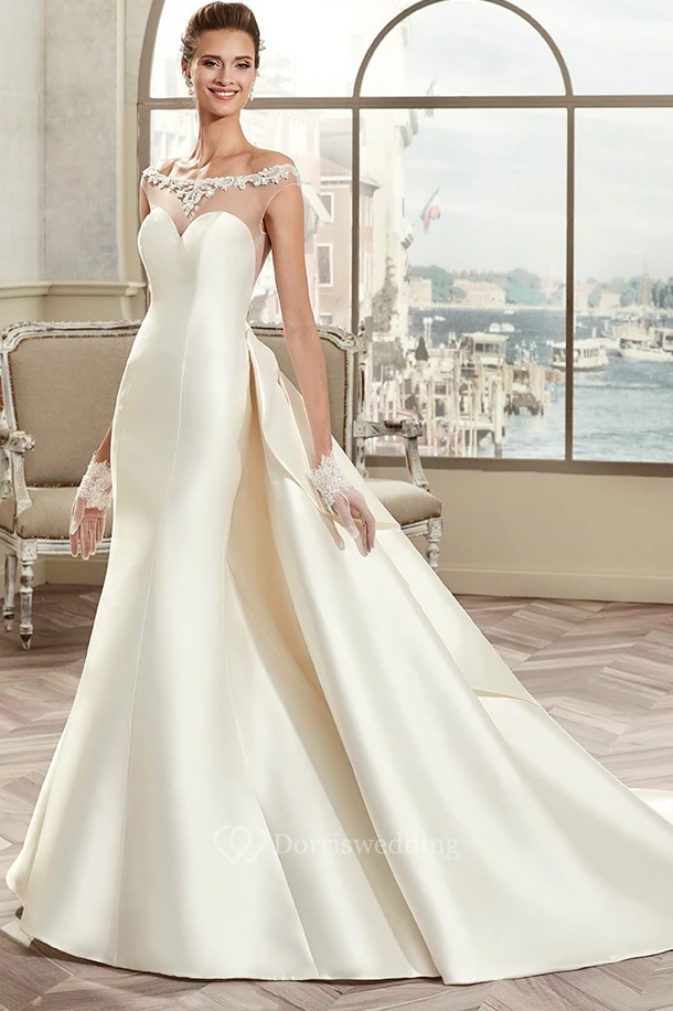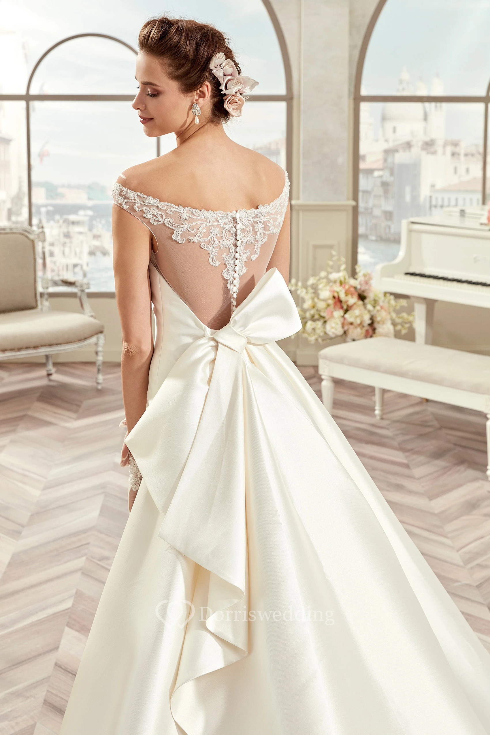 Off-Shoulder Satin Long Wedding Dress With Illusive Design And Back Bow