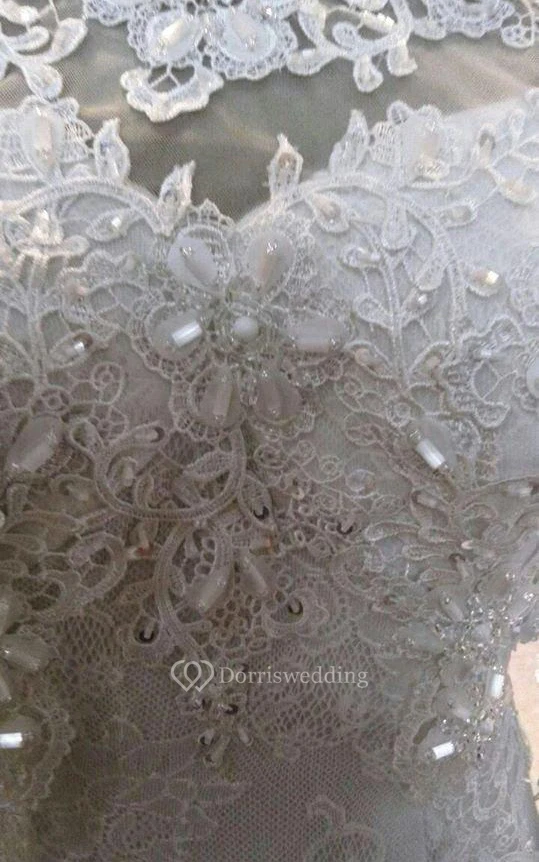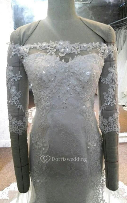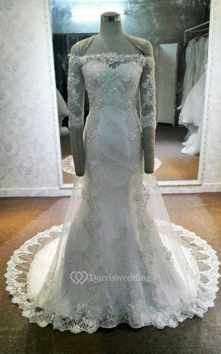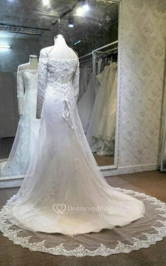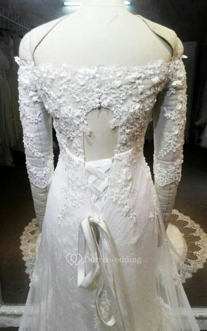 Off-The-Shoulder 3-4 Sleeve Mermaid Lace Dress With Beadings and Lace-Up Back