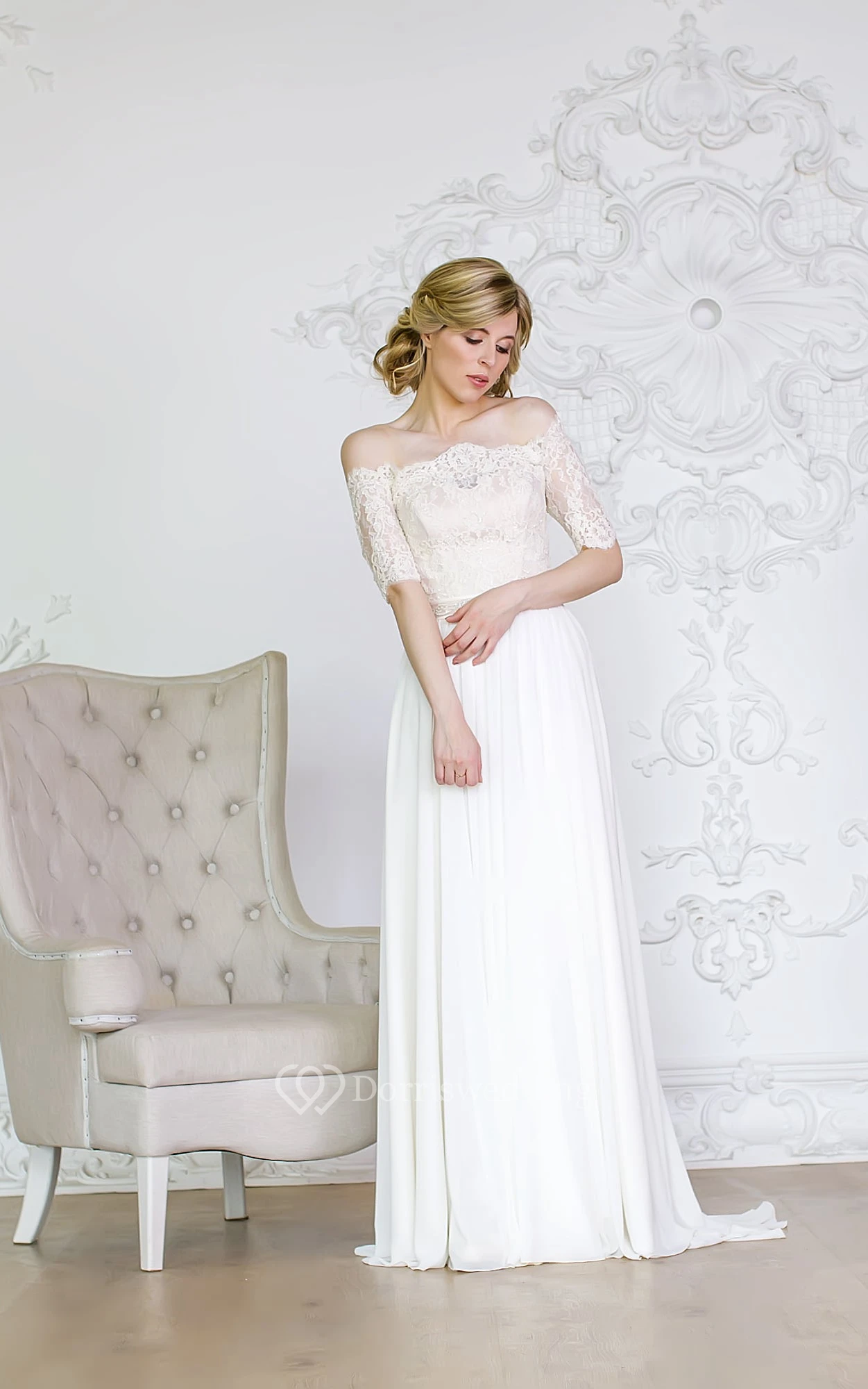 Off-the-shoulder A-line Chiffon Modest Wedding Dress With Lace Bodice