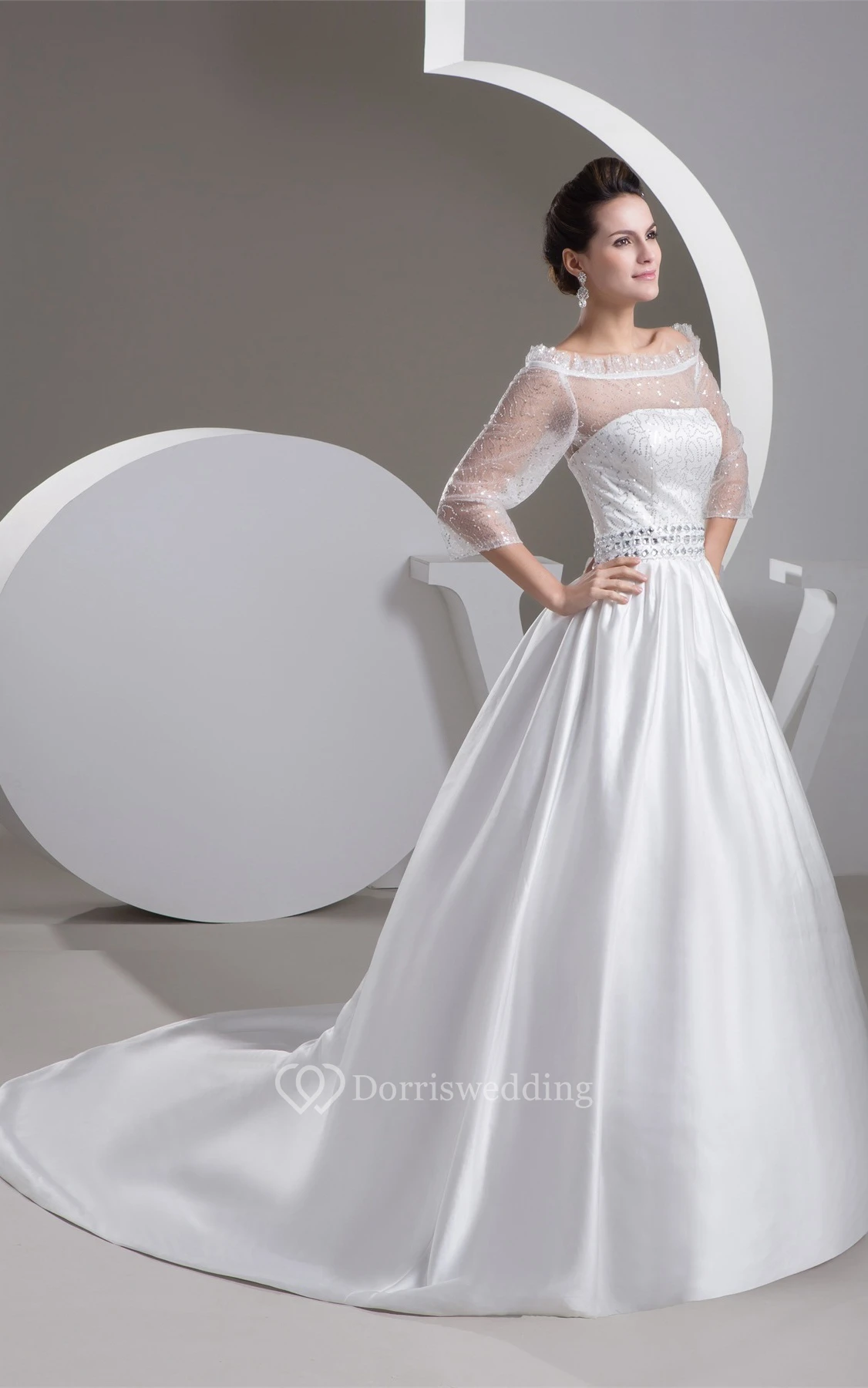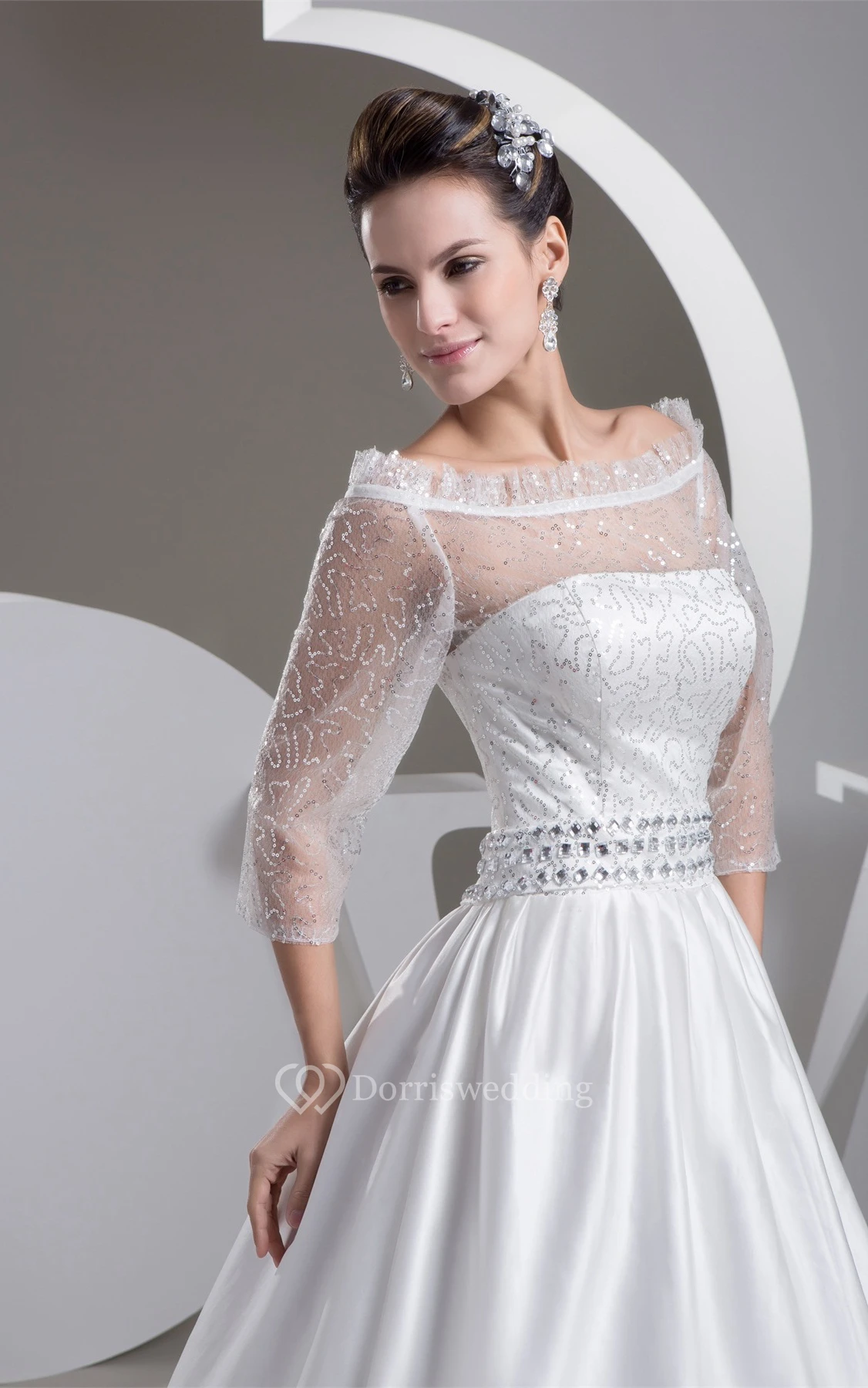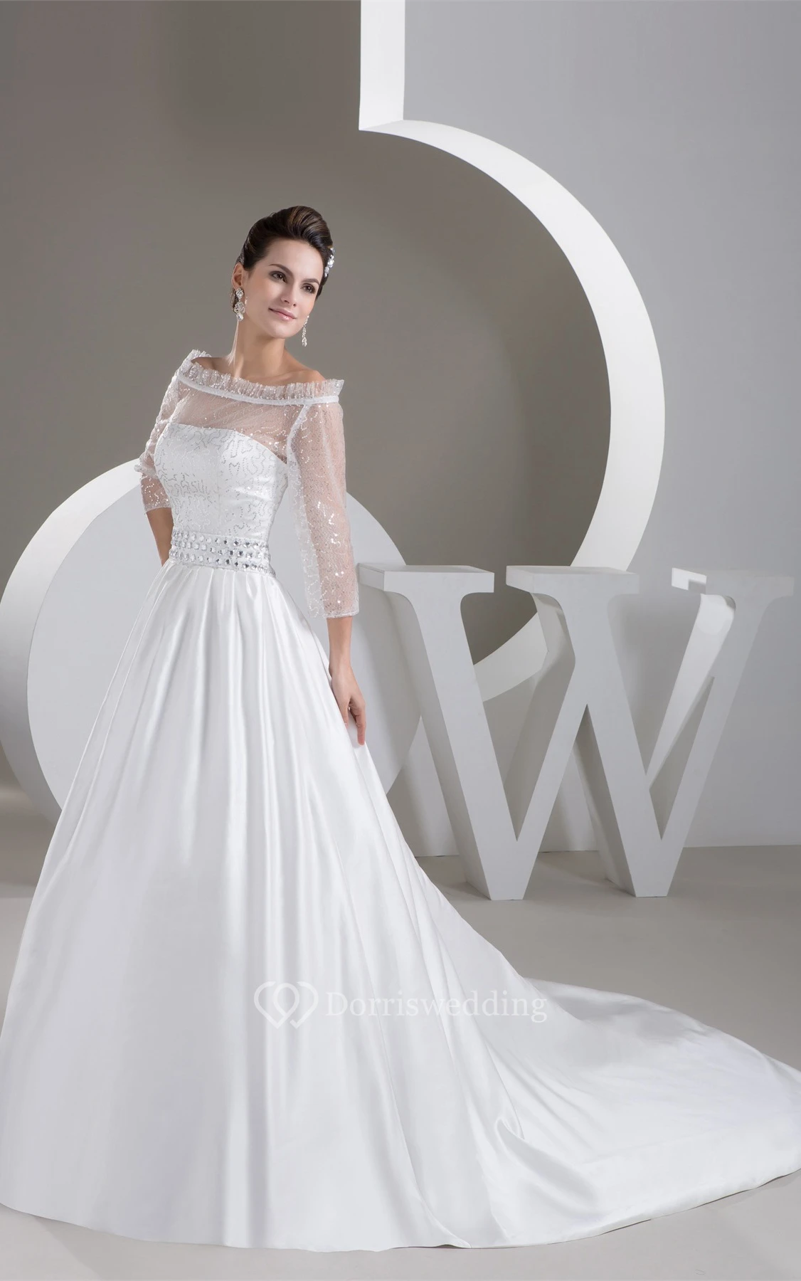 Off-The-Shoulder A-Line Satin Gemmed Waist and Gown With Illusion