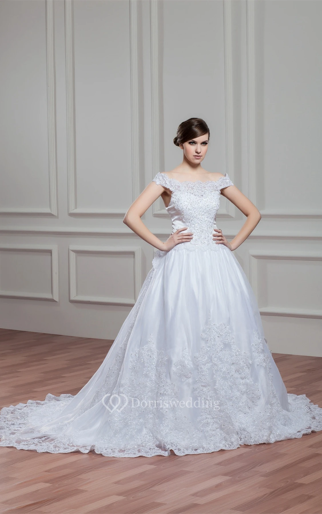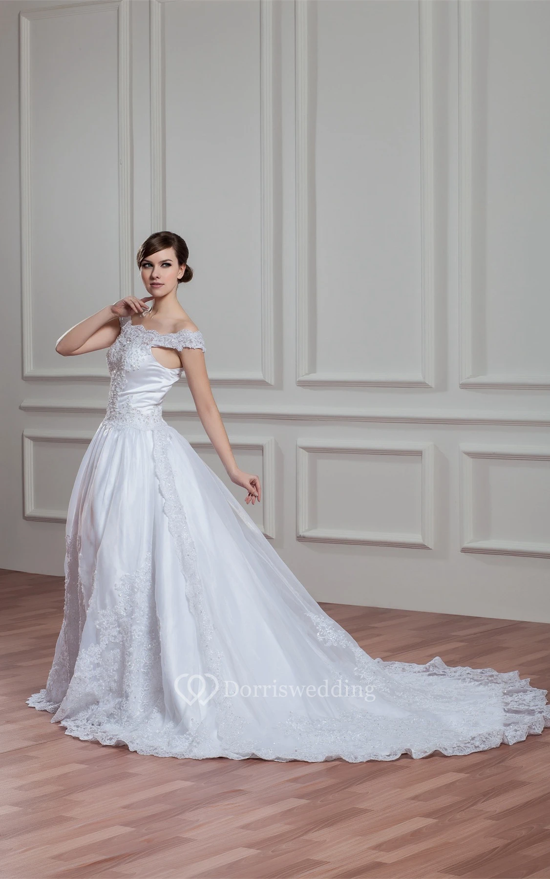 Off-The-Shoulder Appliqued A-Line Gown With Pleats