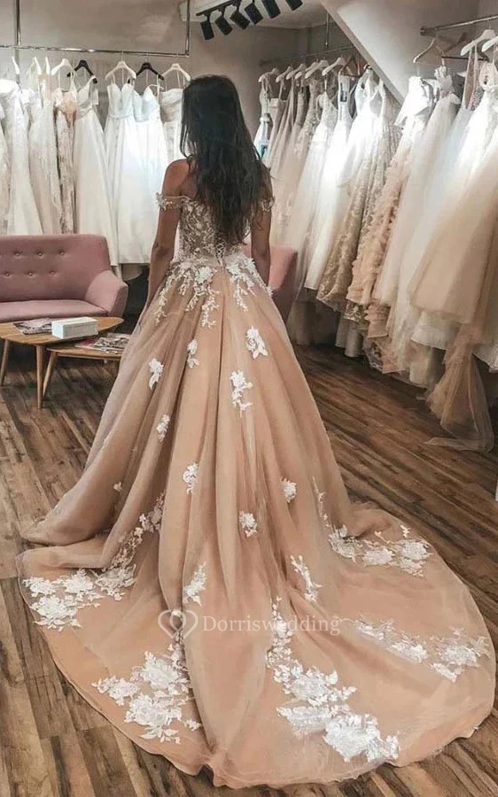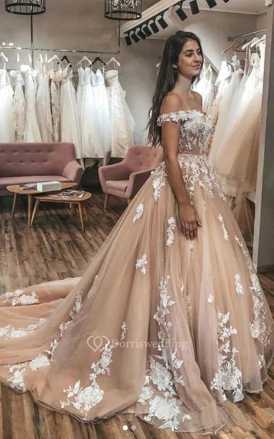 Off-the-shoulder Ball Gown Champagne Lace Applique Exquisite Princess Wedding Dress