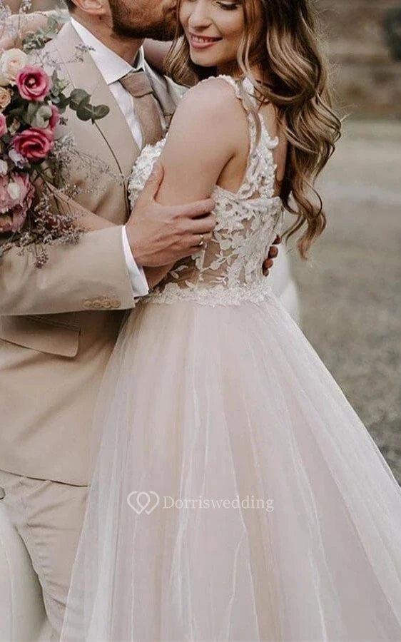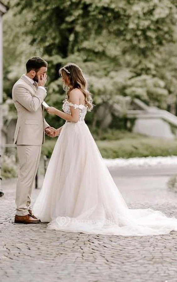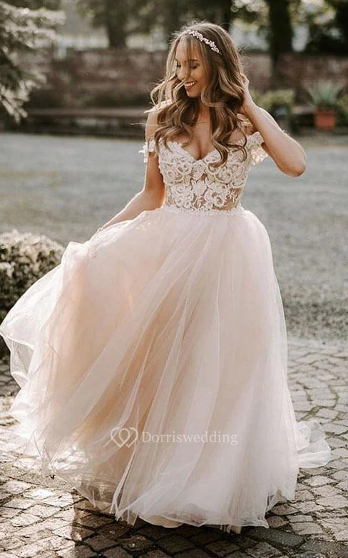 Off-the-shoulder Blush Tulle Flowy A-line Wedding Dress with Lace Top