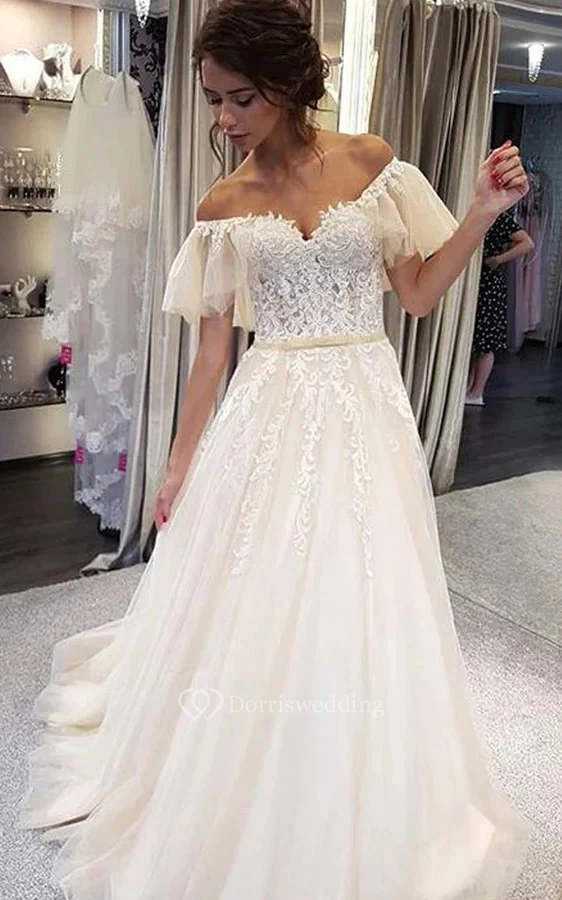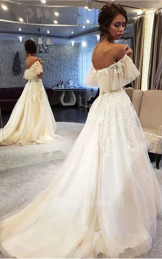 Off-the-shoulder Empire A-line Chiffon Adorable Wedding Dress with Lace Top