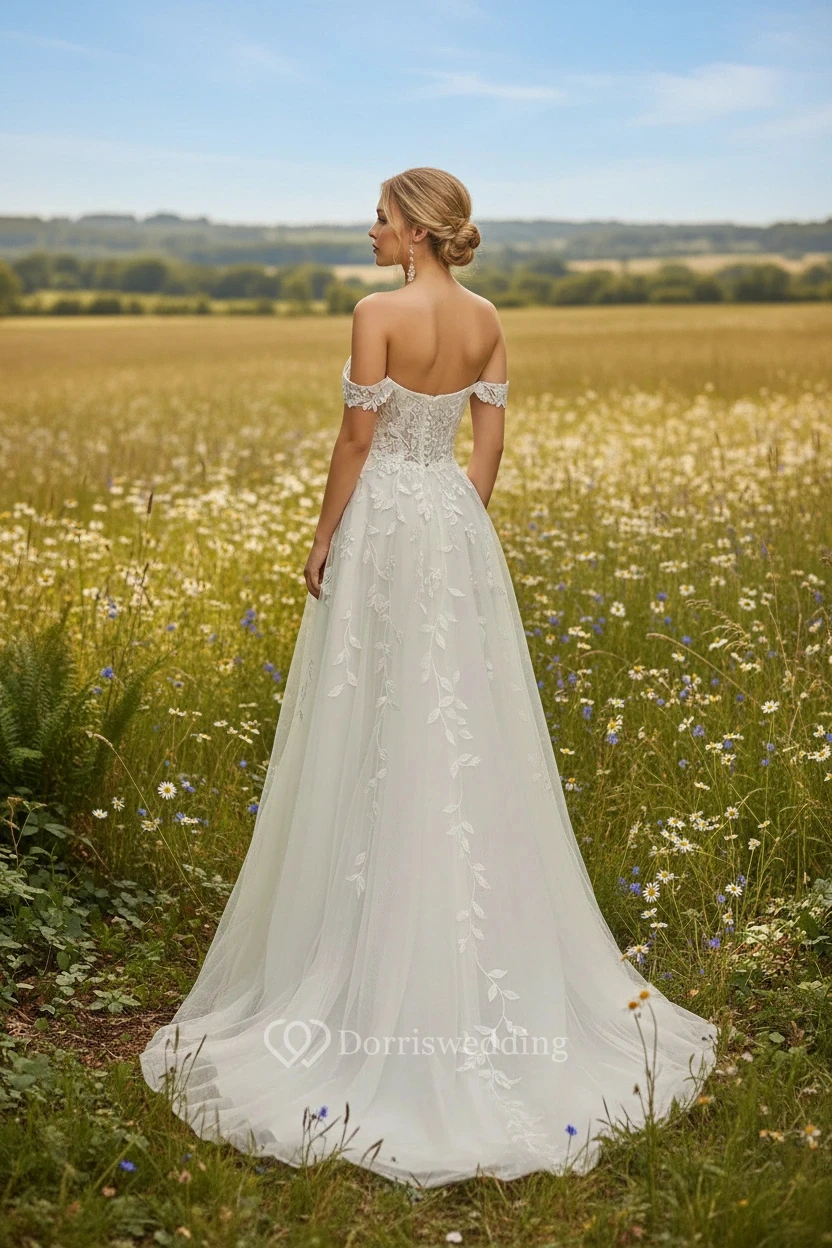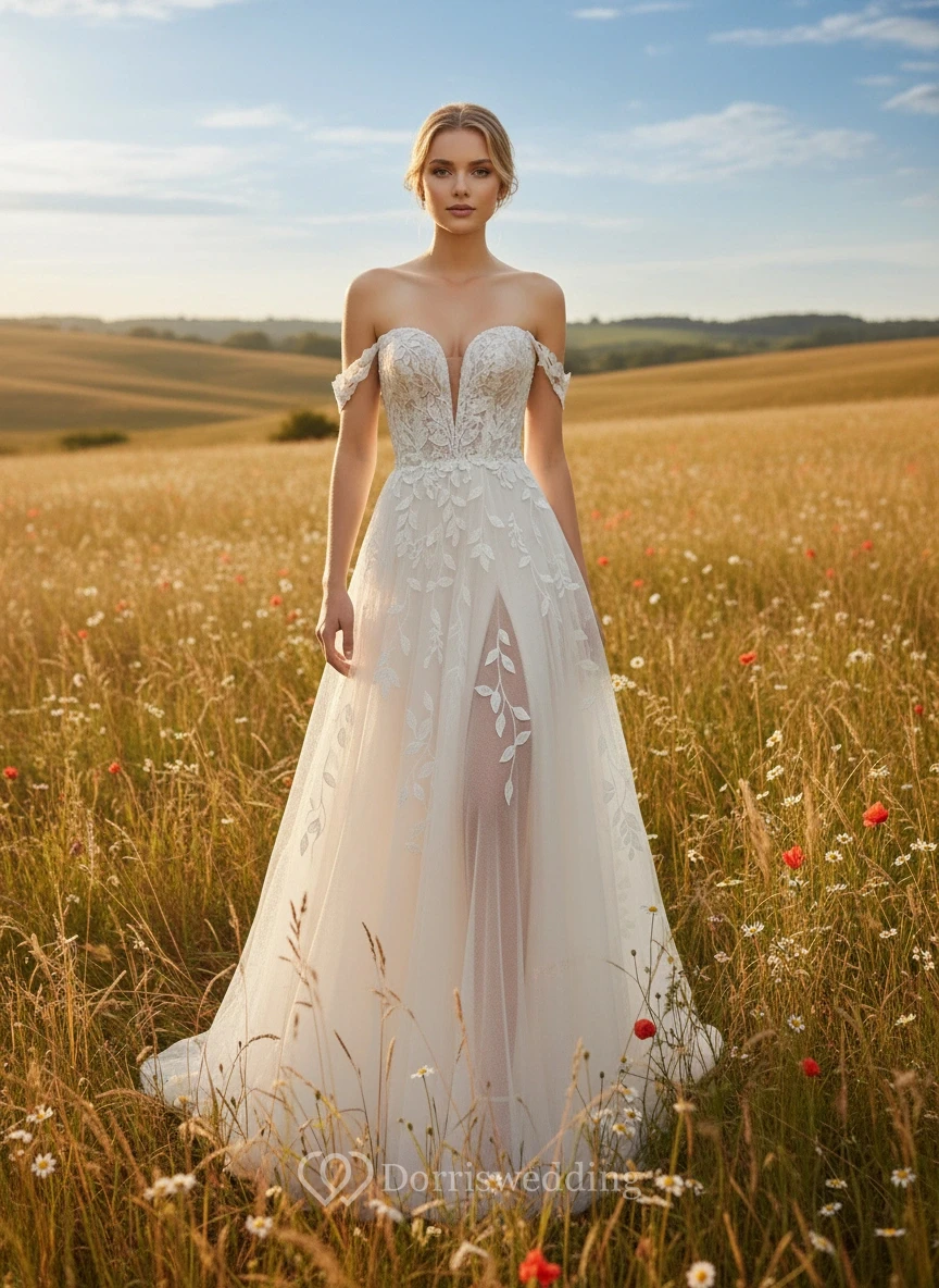 This beautiful gown features an off-the-shoulder neckline with lace details and a skirt adorned with leaf embroidery and a high slit. Set in a vibrant flower field with poppies and daisies against hills, it offers a fresh, bohemian vibe for a picturesque outdoor garden or field wedding.