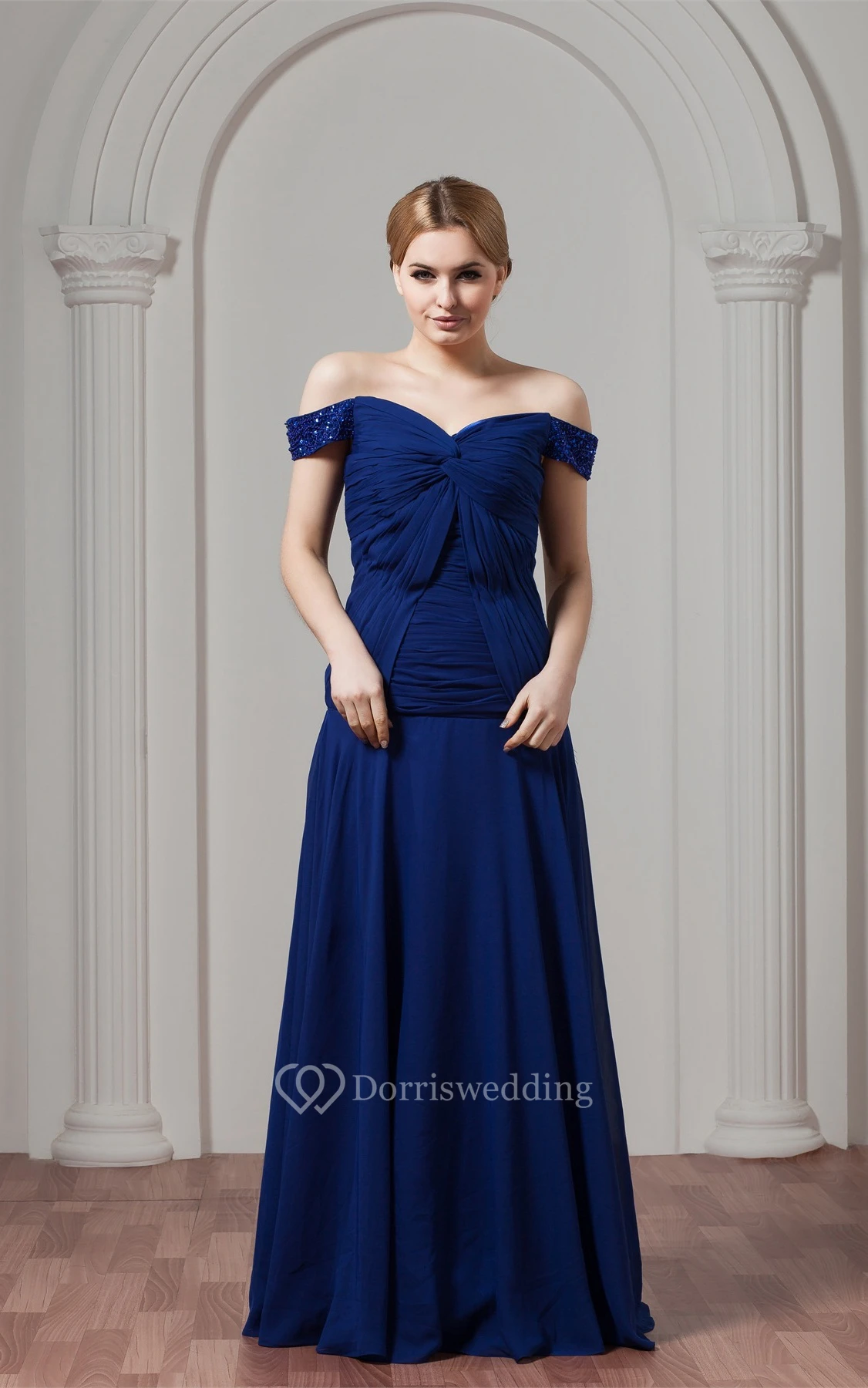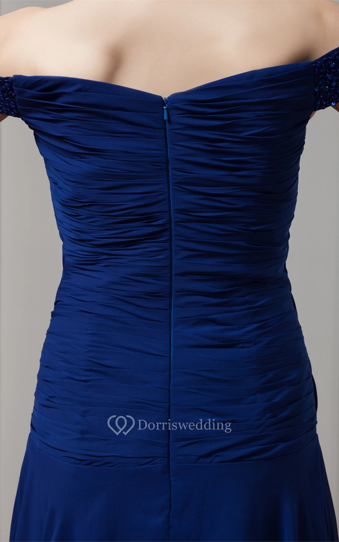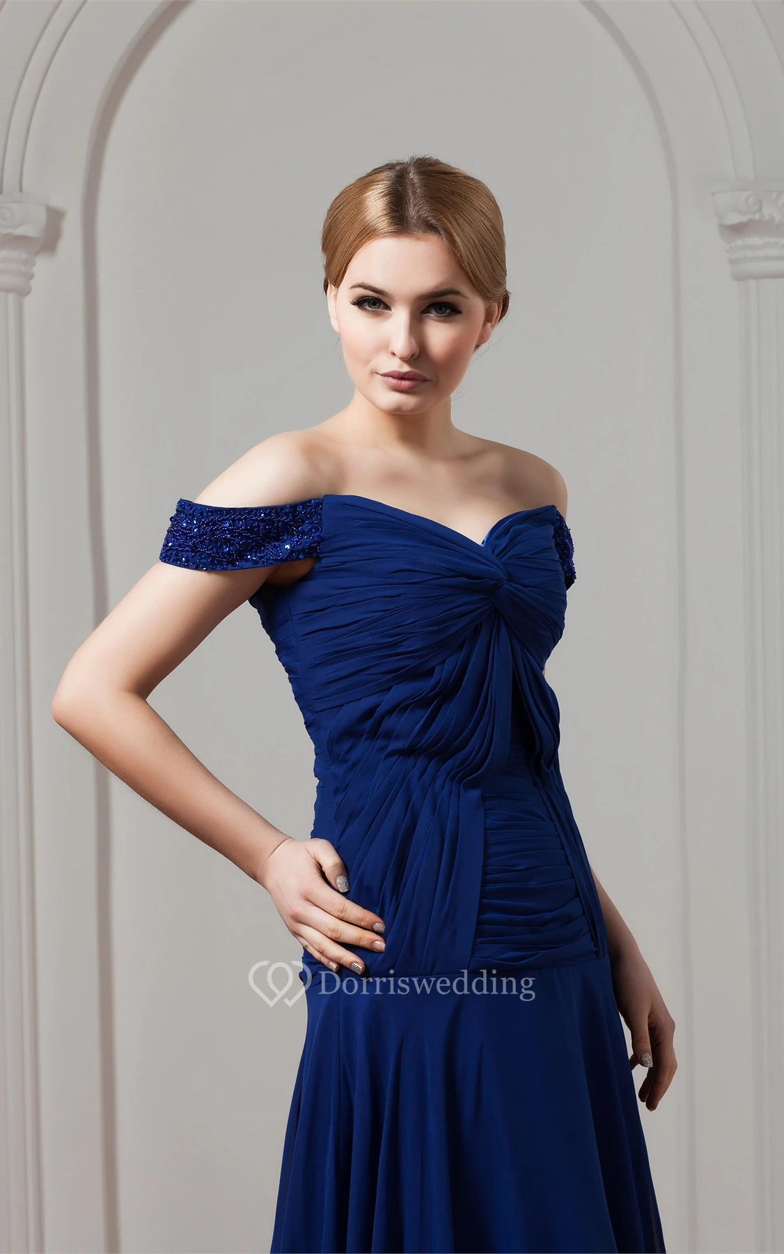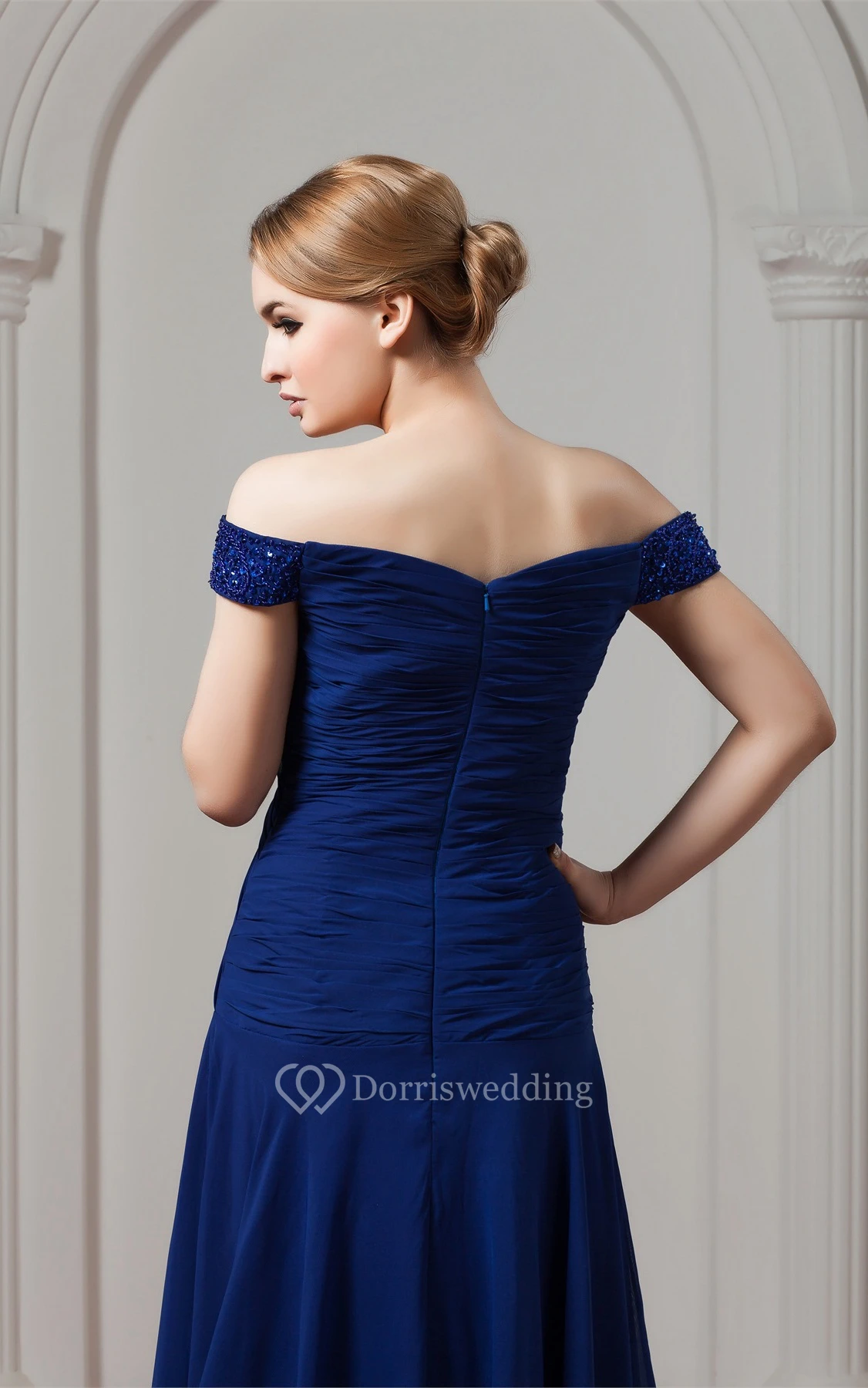 Off-The-Shoulder Floor-Length Chiffon Central Ruching and Dress With Beading