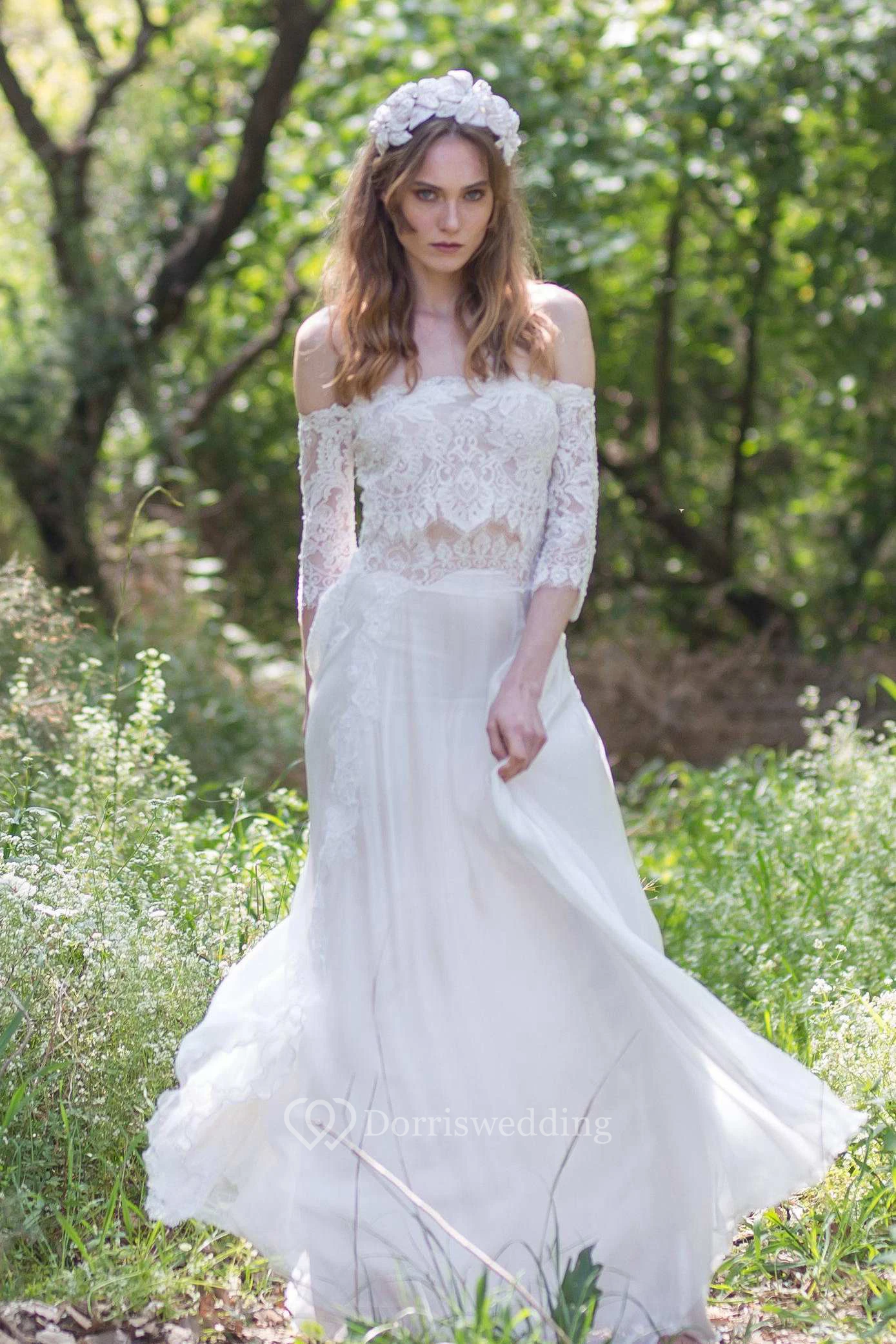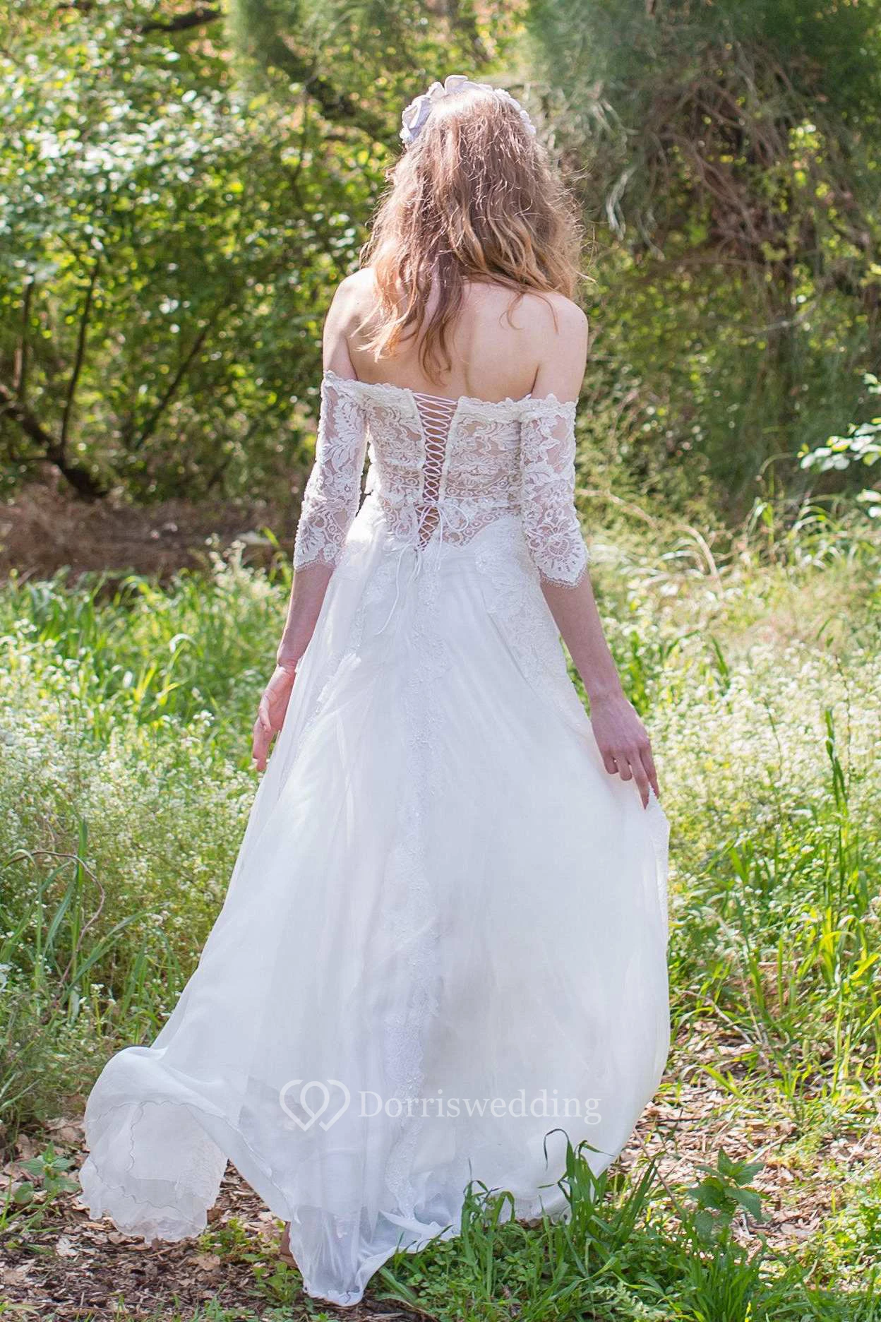 Off-the-shoulder Lace Chiffon Boho Wedding Dress With Corset Back