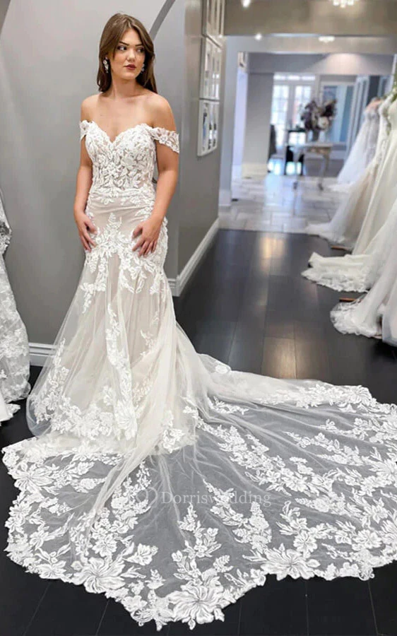 Off-the-shoulder Lace Mermaid Tulle Elegant Wedding Dress Styles with Court Train