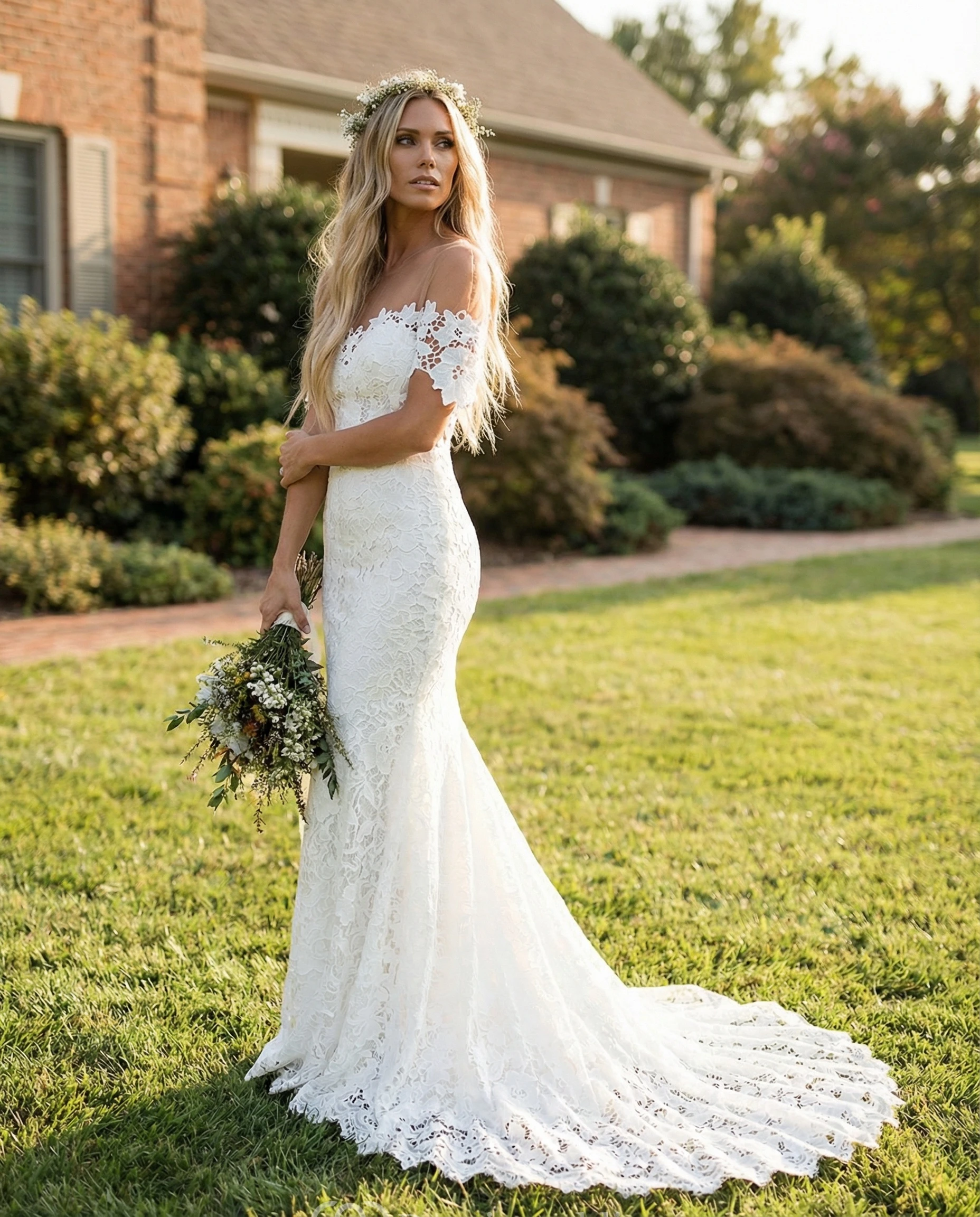 I wore this for my formal wedding and it was perfect. The off-the-shoulder and mermaid shape were exactly what I wanted.