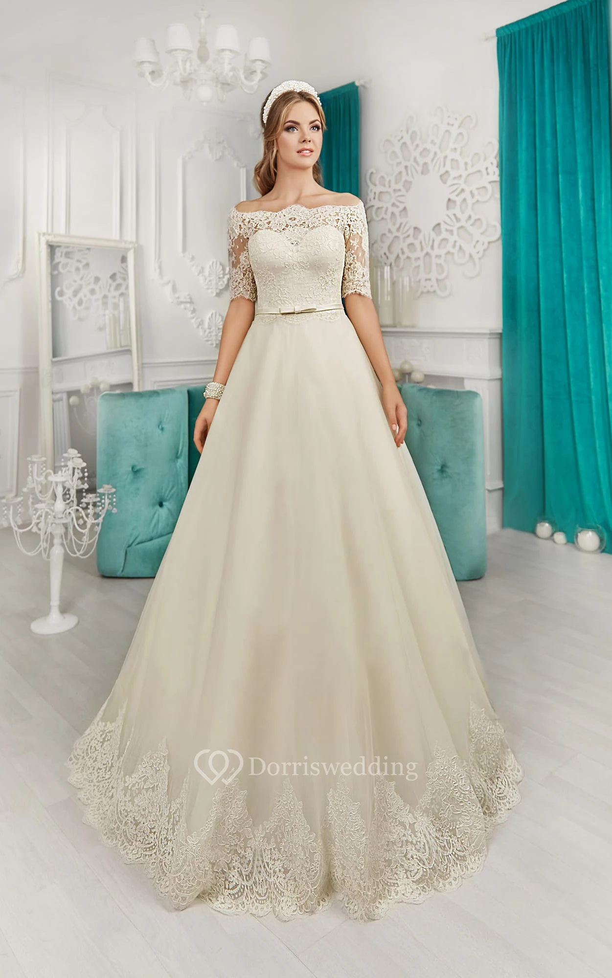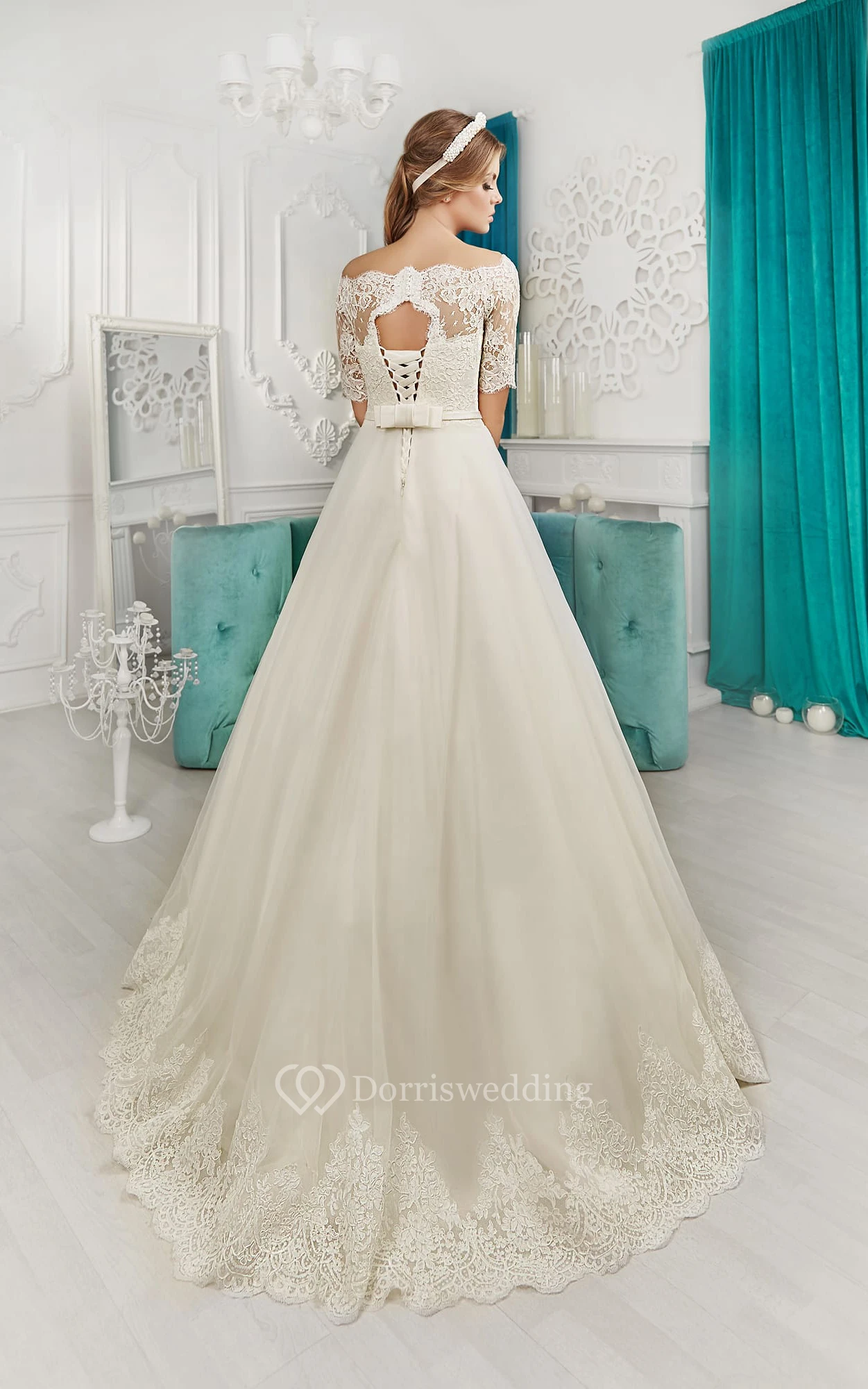 Off-the-shoulder Lace Top Appliques Dress With Bow