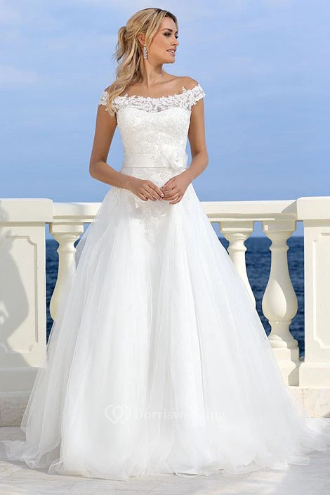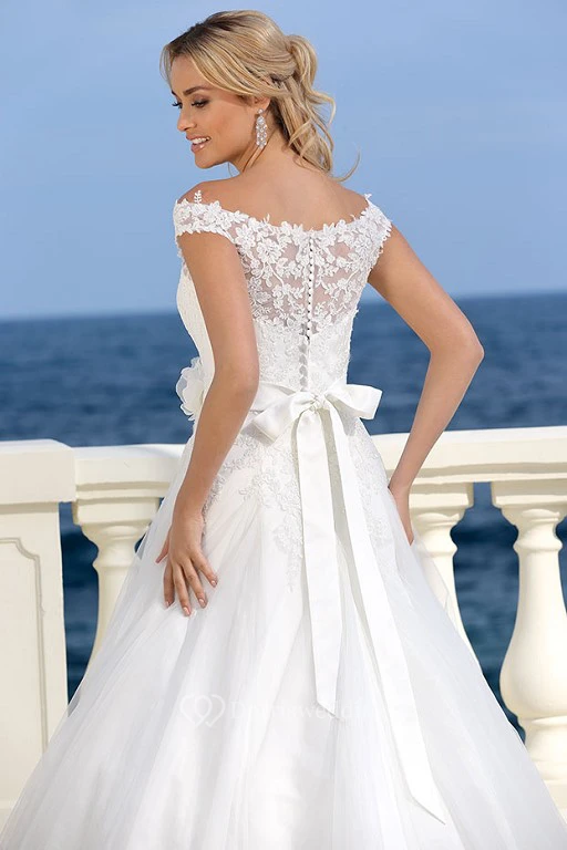 Off-The-Shoulder Long Bowed Appliqued Tulle Wedding Dress
