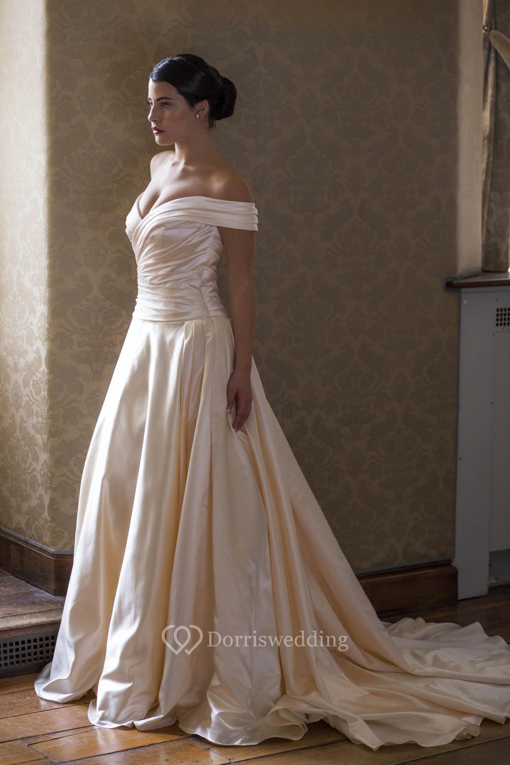 Off-The-Shoulder Long Satin Wedding Dress With Criss Cross And Court Train
