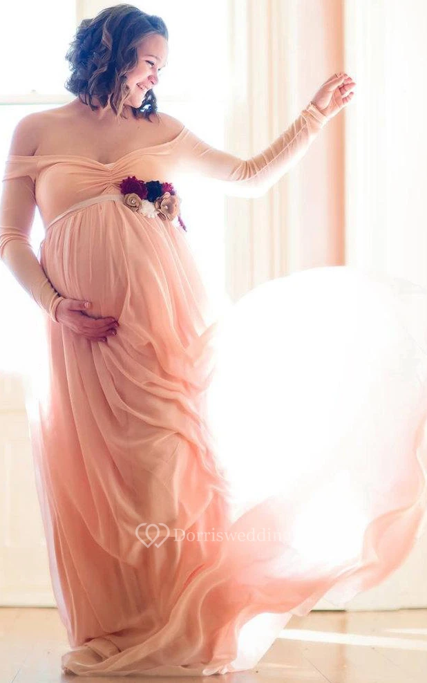 Off-the-shoulder Long Sleeve Chiffon Dress With Split Front&Split