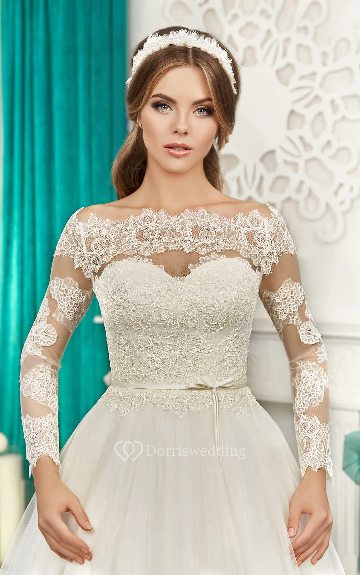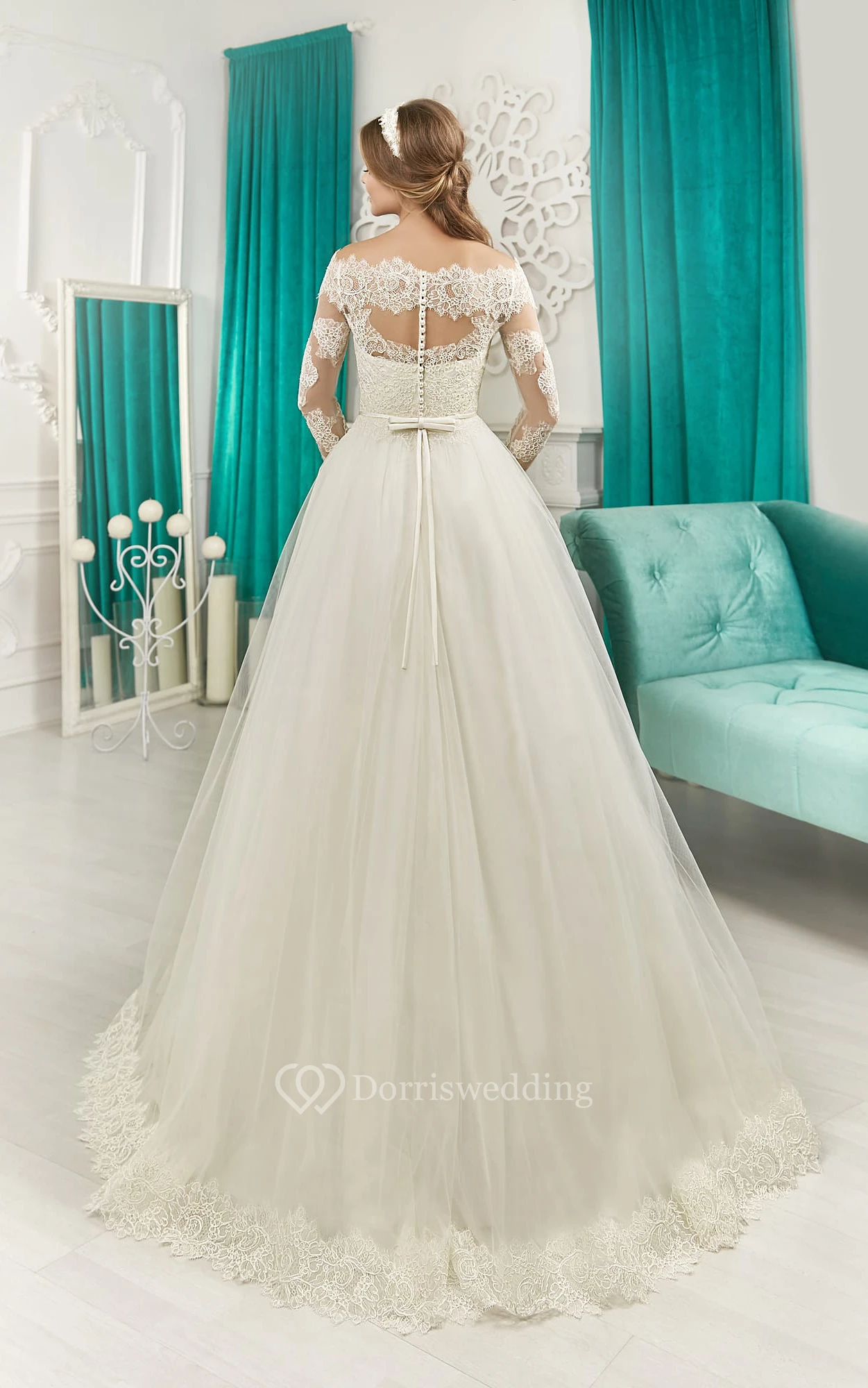 Off-the-shoulder Long Sleeve Illusion Back Bow Lace&Tulle Dress