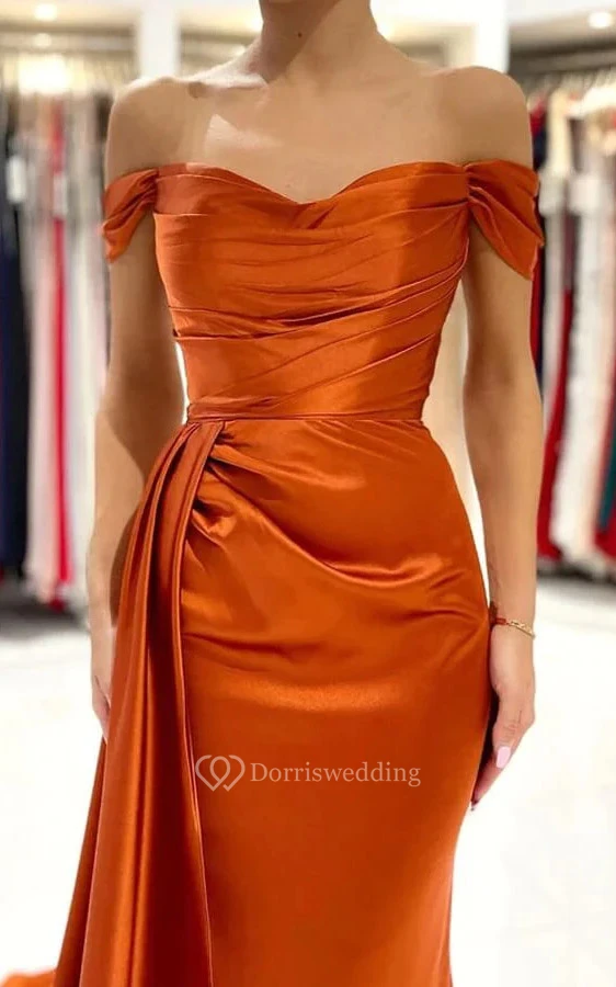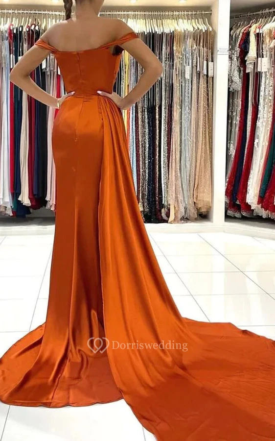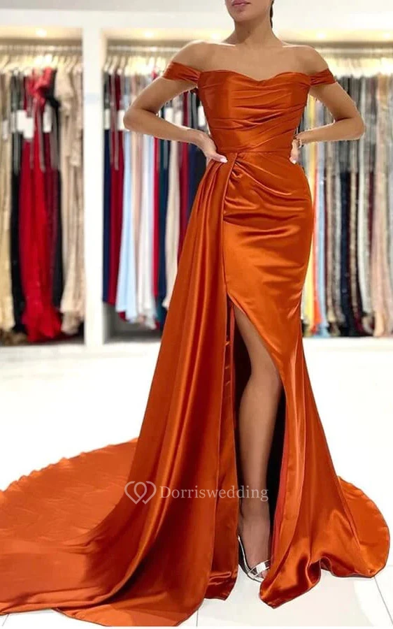 Off-the-shoulder Mermaid Front Split Orange Ruched Satin Prom Dress