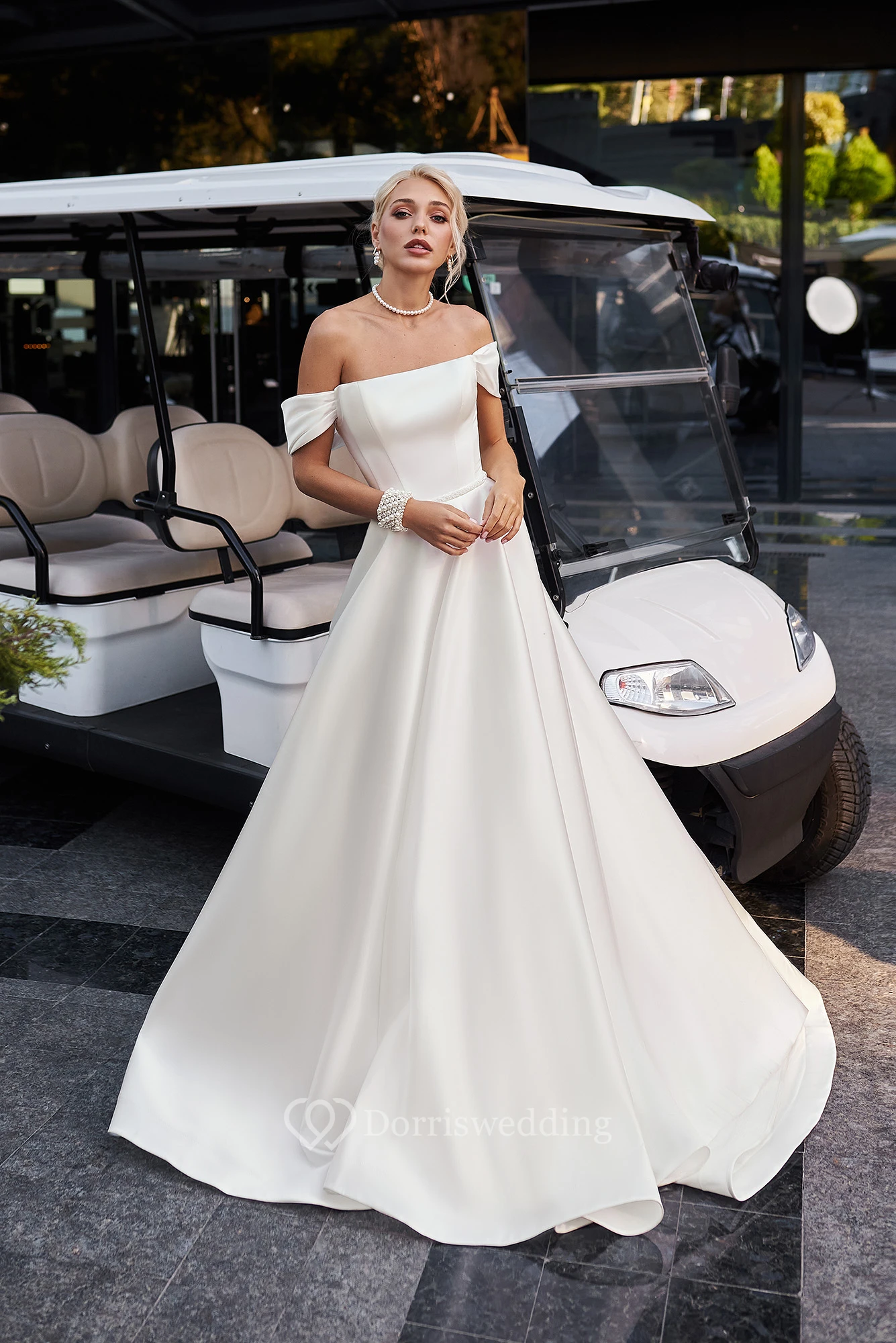 Off-the-shoulder Satin A-line Solid Modern Low-v Back Wedding Dress