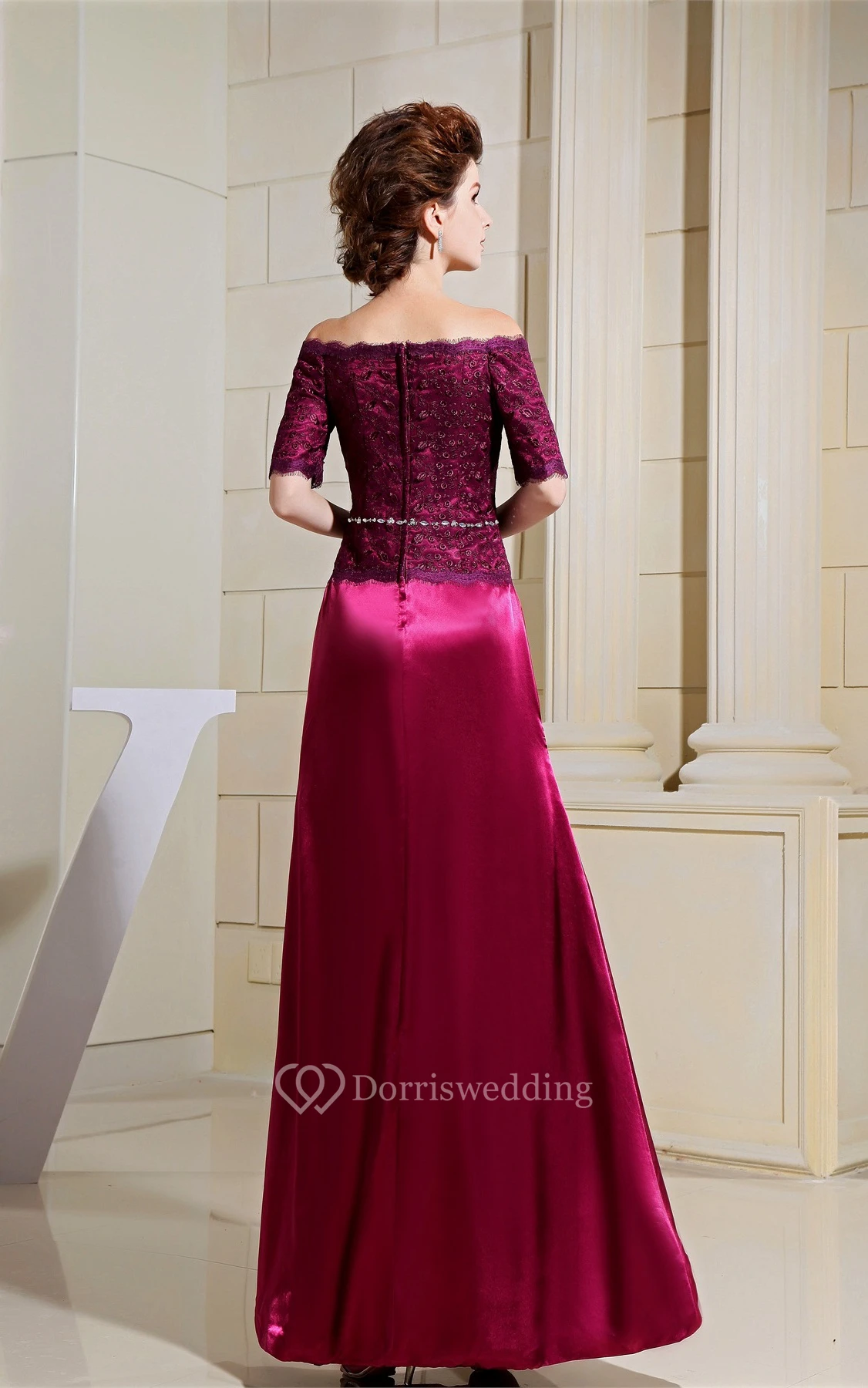 Off-The-Shoulder Satin Sheath Mini-Sleeve Gown With Appliqued Top