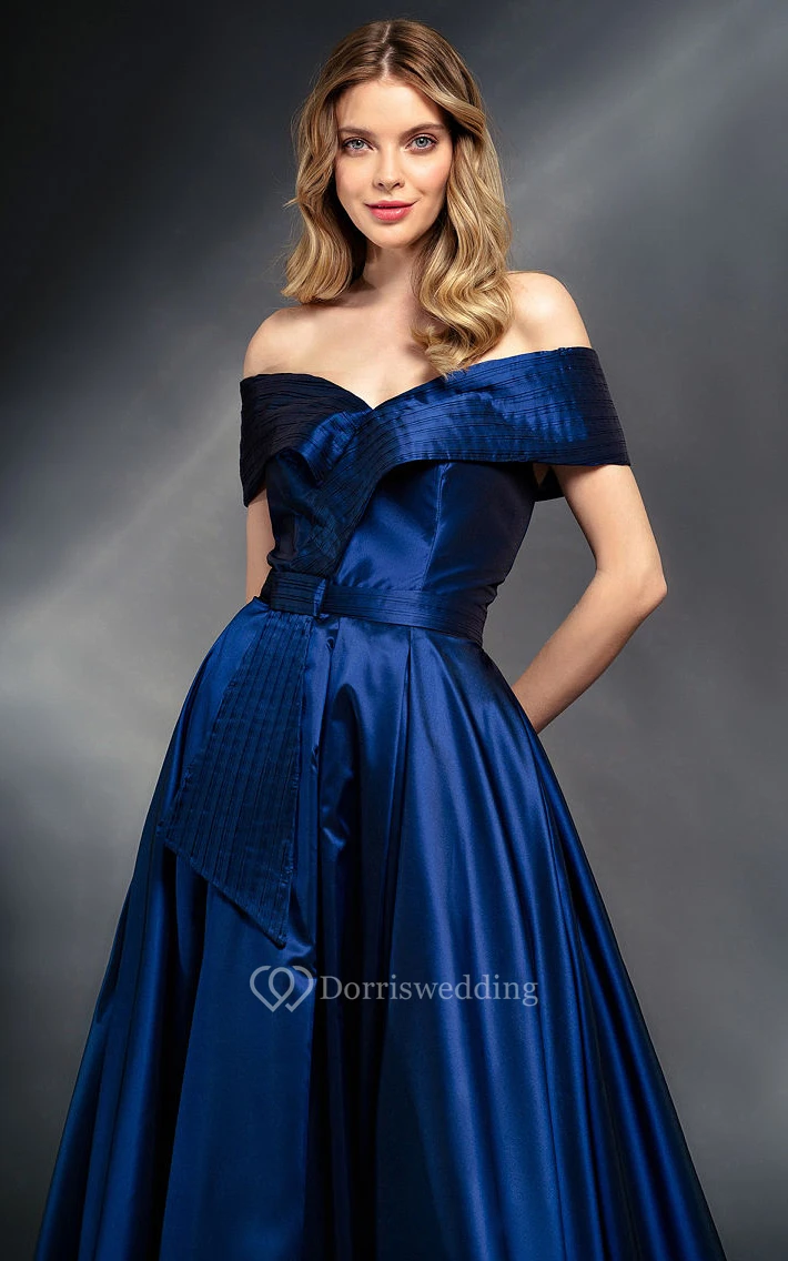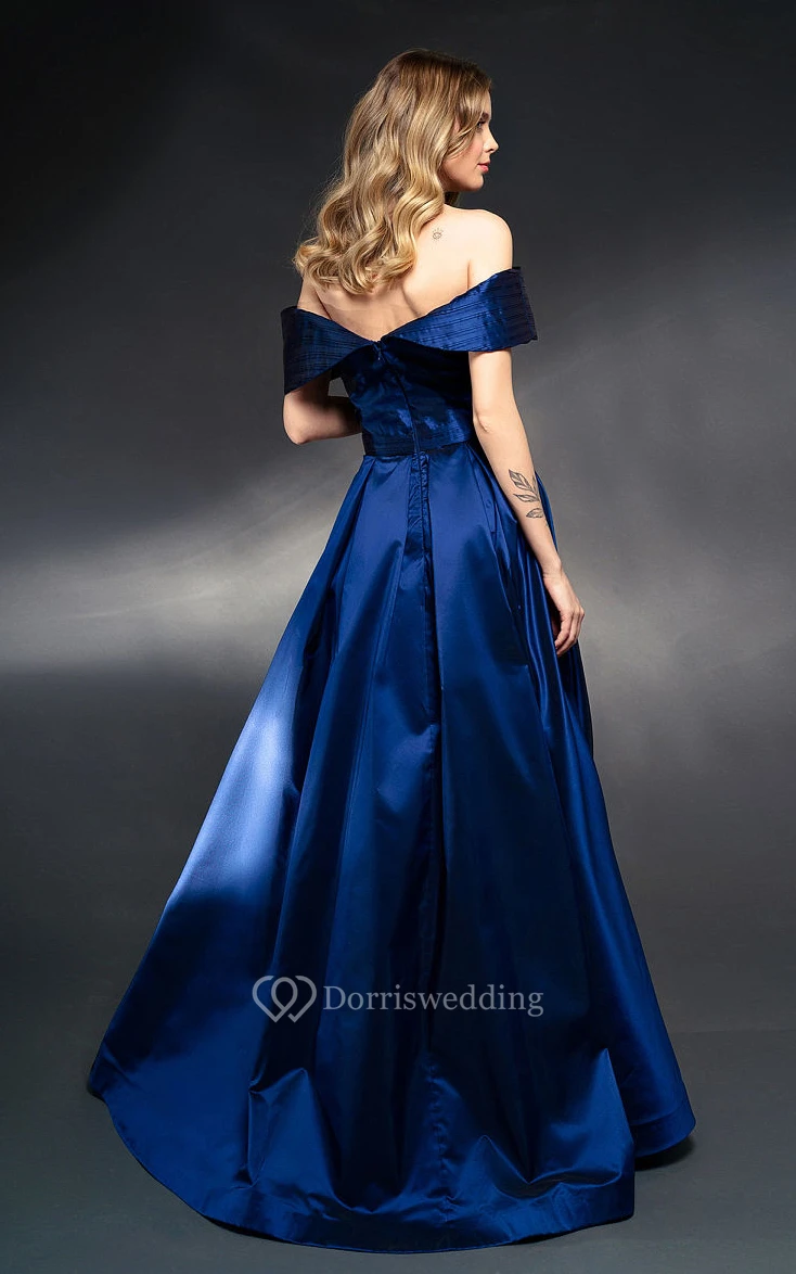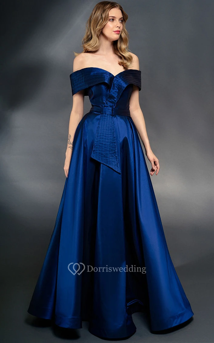 Off-the-shoulder Solid A-line Satin Dress with Sweep Train