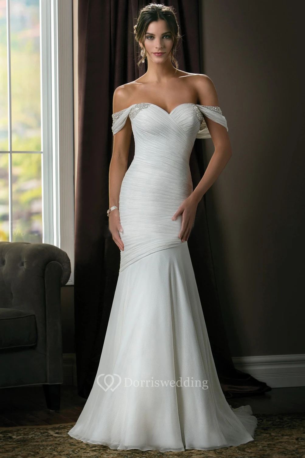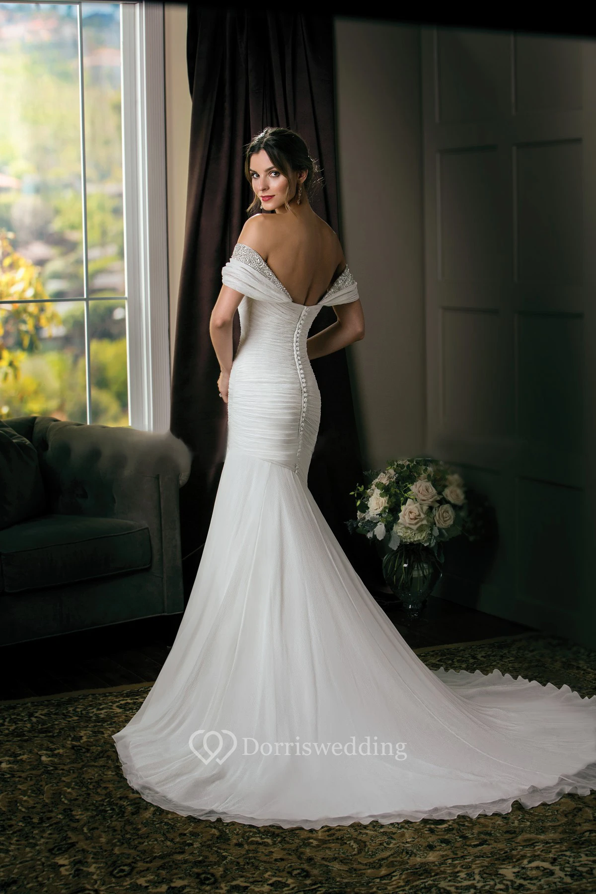 Off-The-Shoulder Trumpet Mermaid Wedding Dress With Ruches And Crystals
