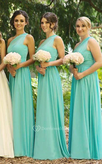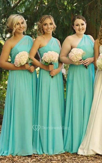 One-shoulder A-line Long Chiffon Dress with Pleats