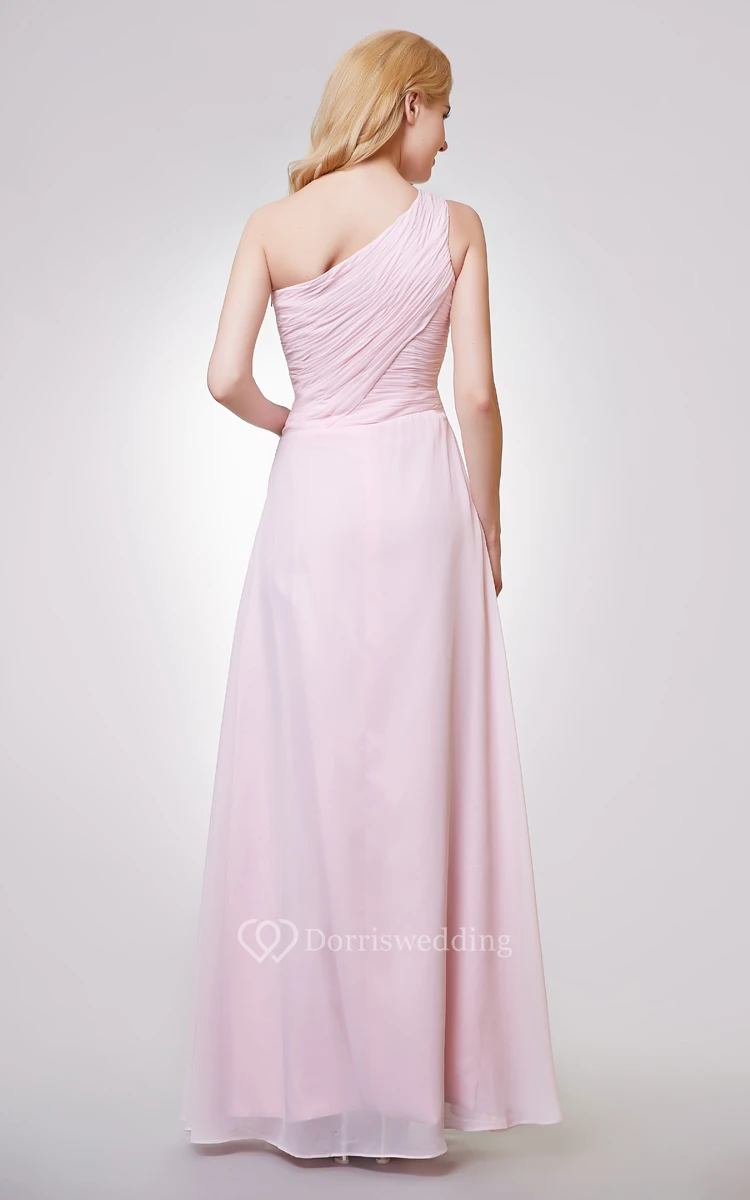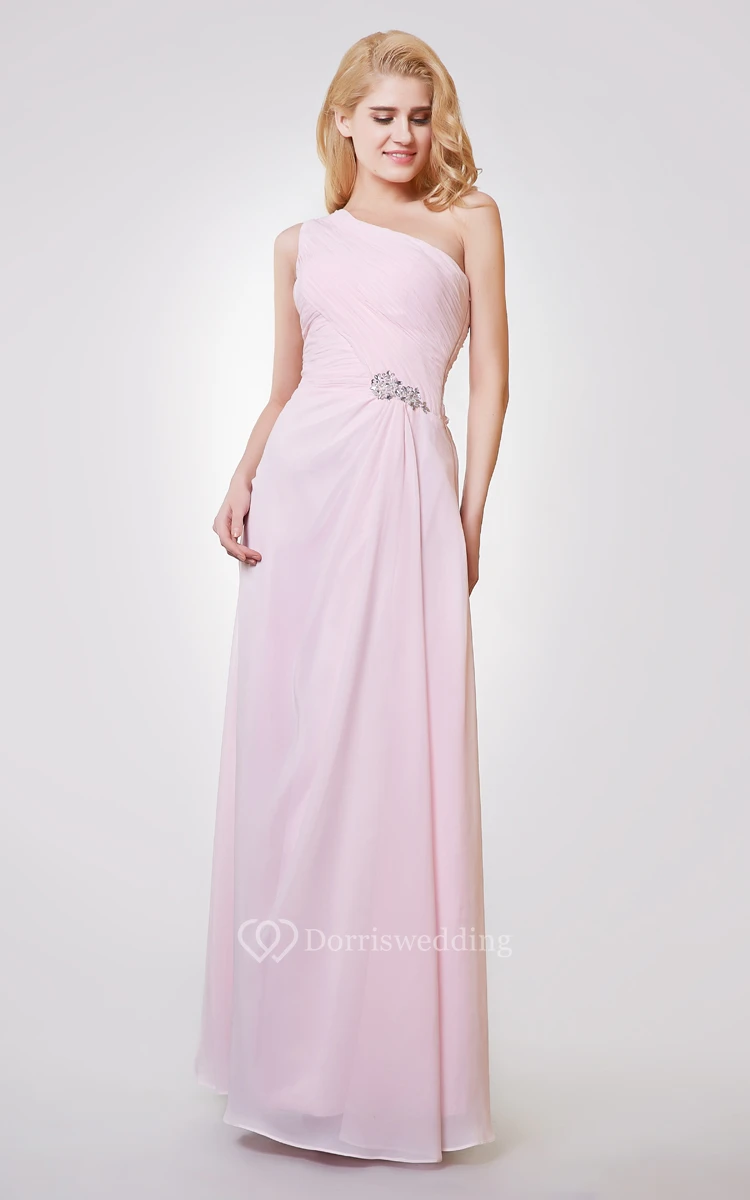 Your bridesmaids will look beautiful on your wedding day in this gorgeous one-shoulder a-line ruched chiffon evening dress. An a-line silhouette slims the form with a cinched in natural waistline adorned with glittering embellishments and a full-length chiffon skirt. Delicate ruching across the bodice in an edgy crossover style completes the look making for the perfect bridesmaid gown for any style of wedding.