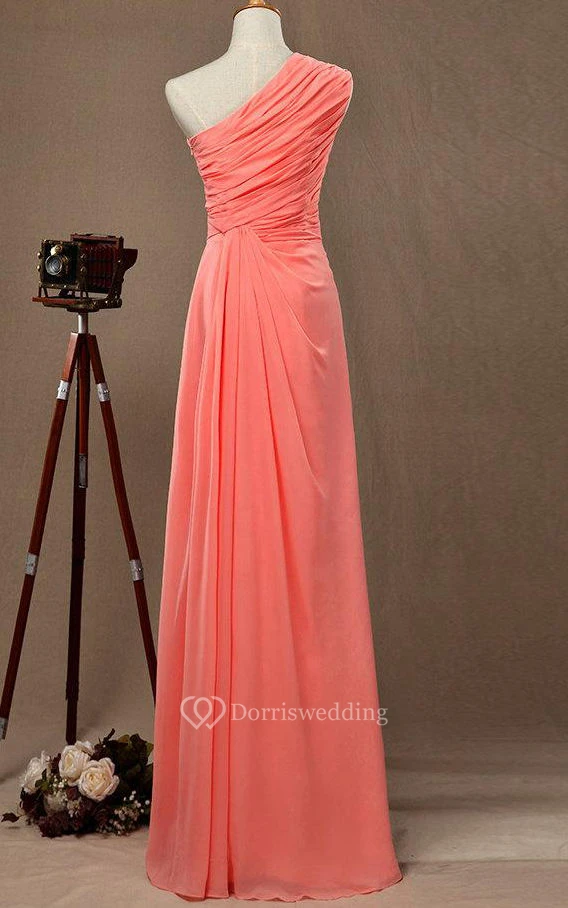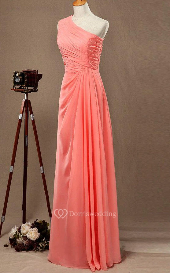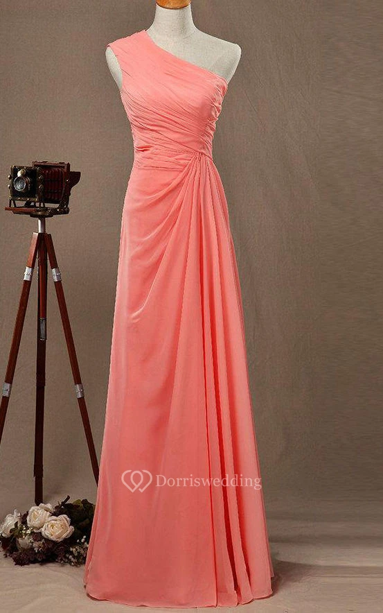 One Shoulder A-line Pleated Chiffon Floor Length Dress With Ruching