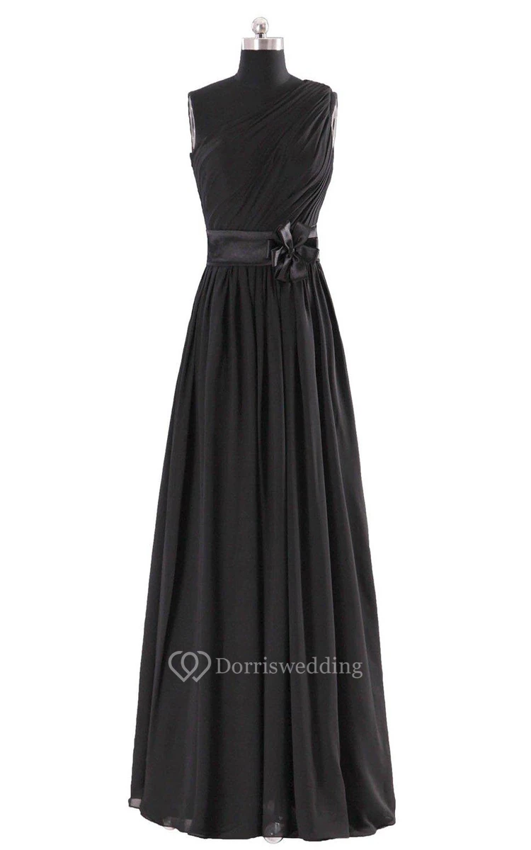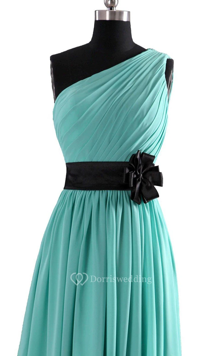 One-shoulder A-line Pleated Chiffon Gown With Belt