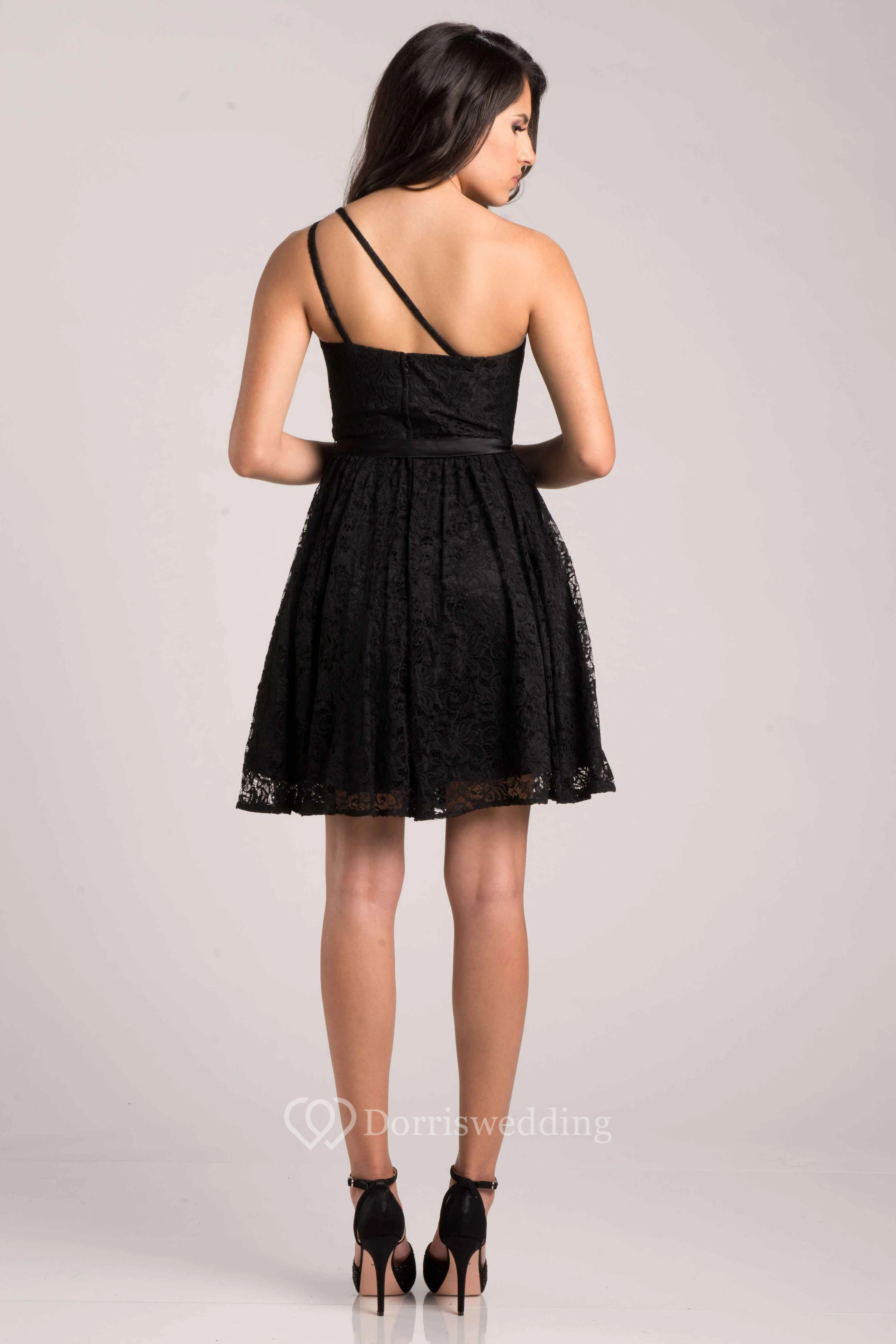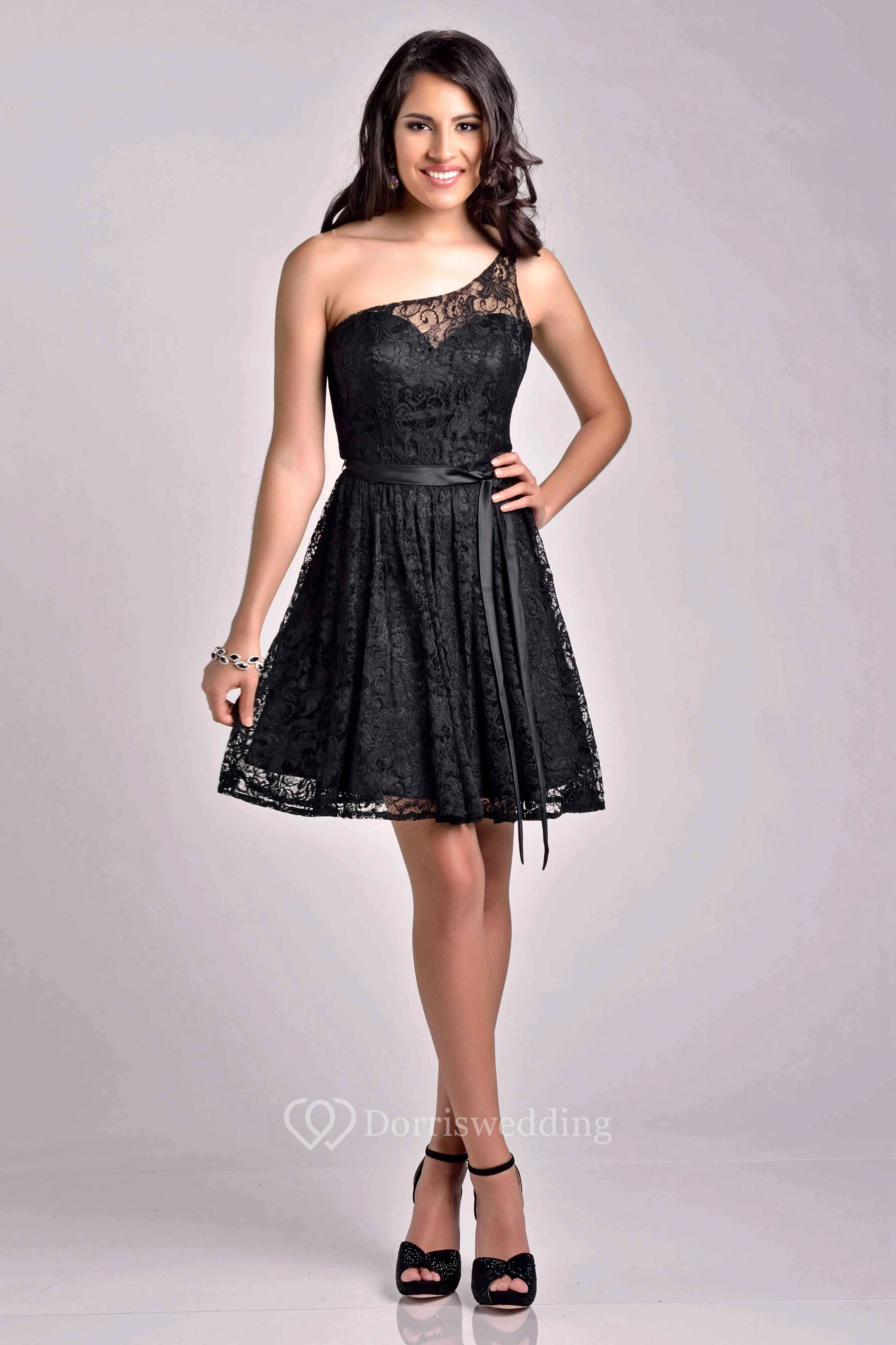 One-Shoulder A-Line Short Lace Bridesmaid Dress With Slim Satin Sash